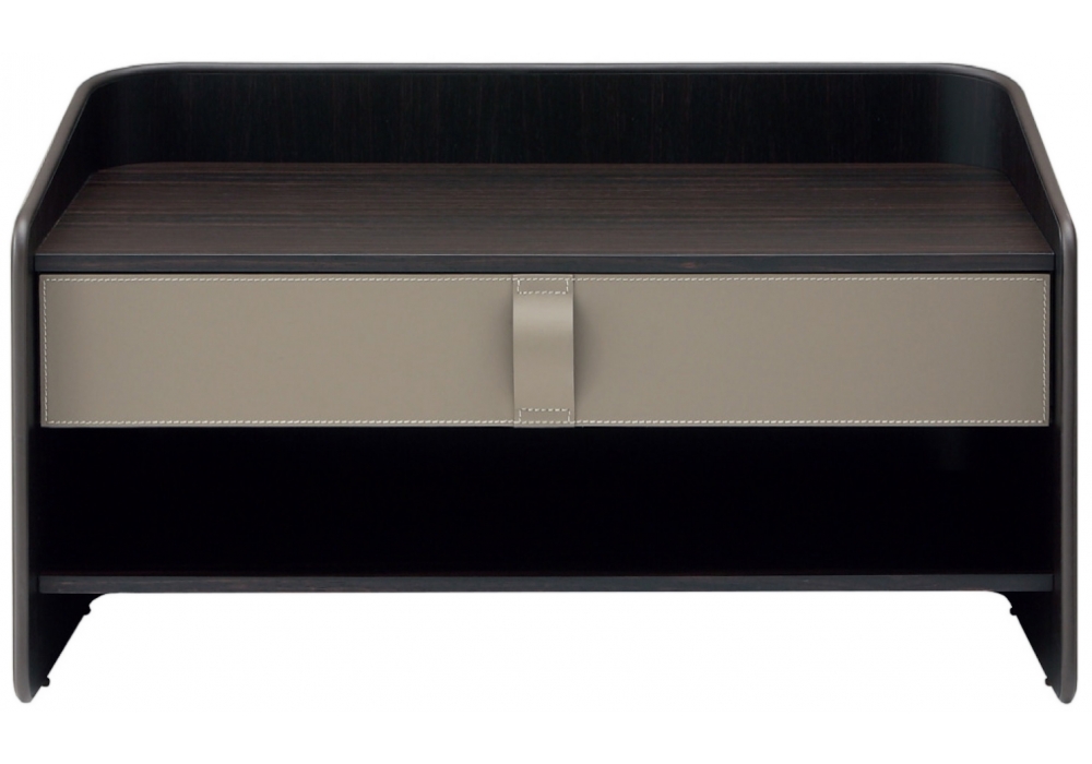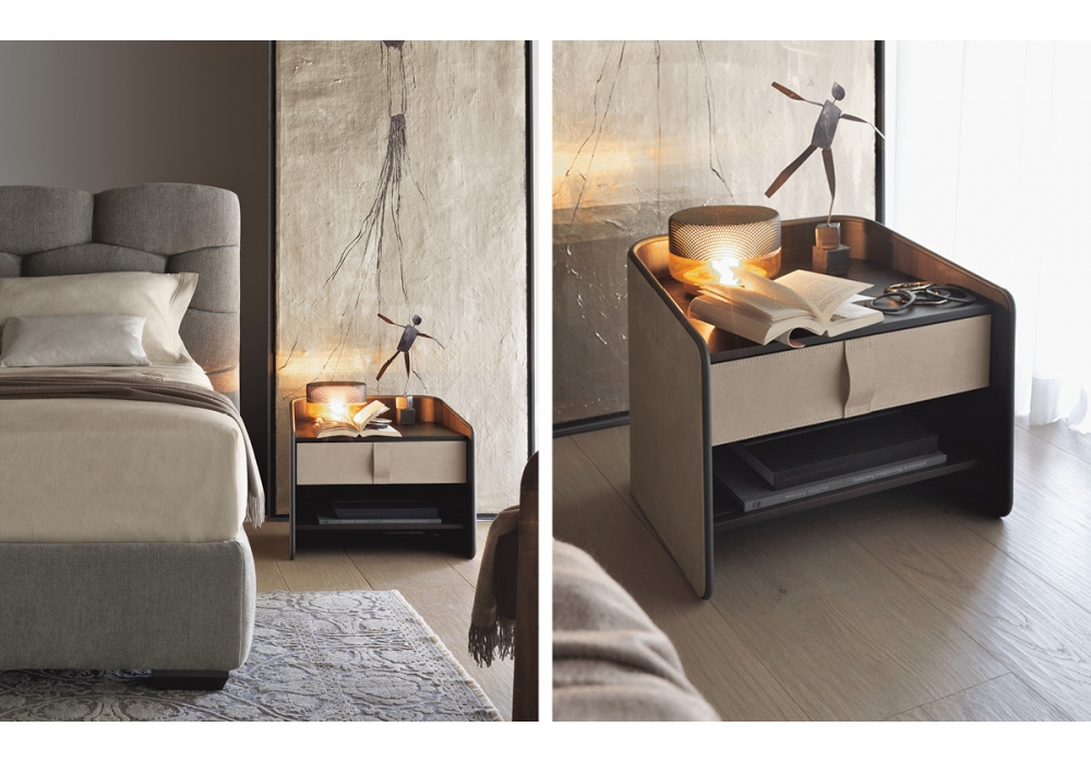 Gentleman conçue par Carlo Colombo pour Flou est une table de chevet avec structure en bois multipli de hêtre courbé revêtu extérieurement en cuir. La surface intérieure est en ébène finition mate. Partie frontale et poignées en cuir. L'élégance de les lignes, le précieux des matériaux et le soin dans l'exécution expriment pleinement les valeurs du véritable "Made in Italy", Également disponible en 3 différentes dimensions.