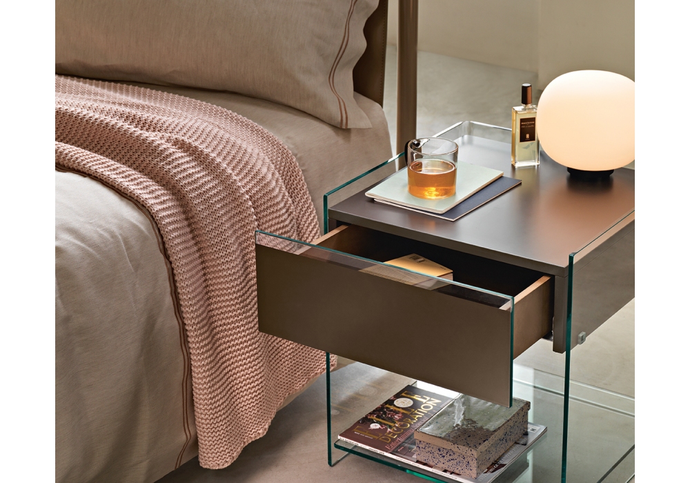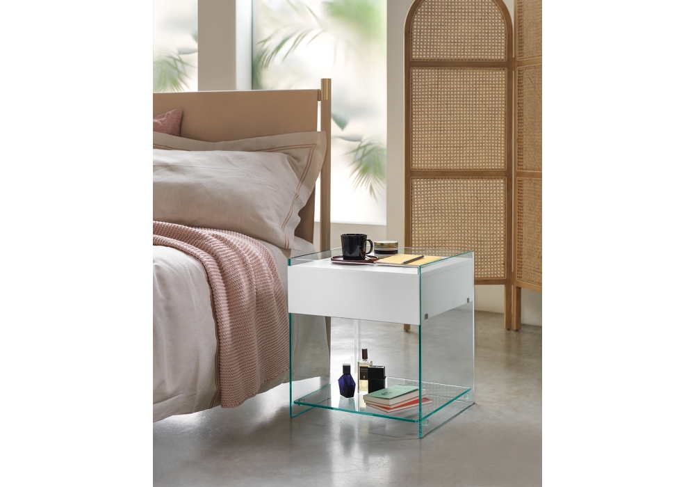 Dino conçue par CRS Fiam est une table de chevet avec structure en verre courbé avec tiroir en bois laqué finition blanc, noir ou gris brun et façade en verre assortie. Sur demande, il est disponible avec structure en verre extralight et tiroir blanc, verre fumé et tiroir noir ou verre bronze et tiroir marron.