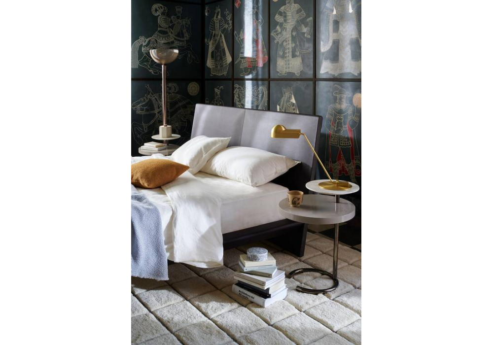 L42 Acute conçue par Rodolfo Dordoni est une table de chevet avec structure en métal anthracite ou bronze à canon, équipée de deux étagères: une supérieure pivotante en marbre brillant et une inférieure en bois laqué brillant.