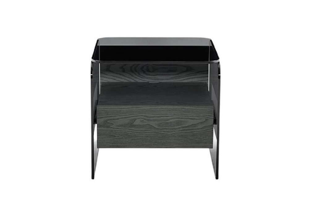 Holly conçue par Pinuccio Borgonovo pour Gallotti&Radice est une table de chevet avec un tiroir. Structure en frene laque’ noir a‘ pore ouvert ou gris smoke. Tiroir monte sur glissieres a‘ extension complete. Plateau et cotes en verre trempe’ “grigio Italia” fume’ ou en verre extralight de 10 mm d’e’paisseur. Pieces metalliques en aluminium brosse’ anodise’ noir. Plateau supérieur du tiroir en frene laque’ noir a‘ pore ouvert ou en frene laque’ gris smoke a‘ pore ouvert comme la structure. Alternativement disponible sur demande en verre Craquele’ ou laque dans la finition exclusive brossee “cashmere” dans les coloris gold grey ou anthracite.