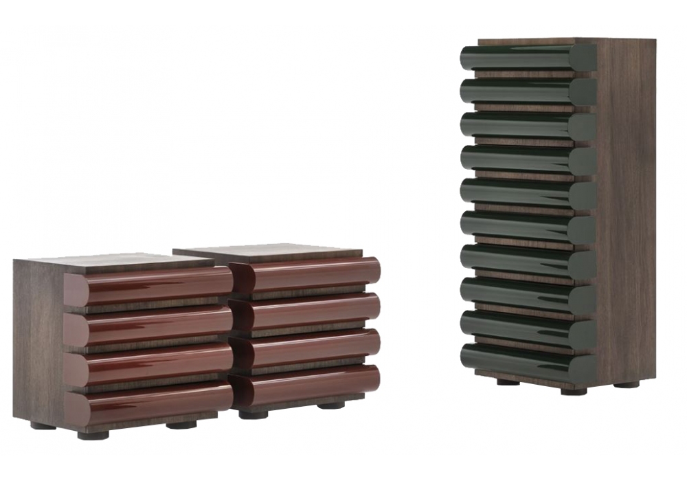 Storet conçue par Nanda Vigo pour Acerbis est une une table de chevet en frêne noir ou structure en noyer teinté foncé et des tiroirs en laqué brillant disponible en différentes couleurs.