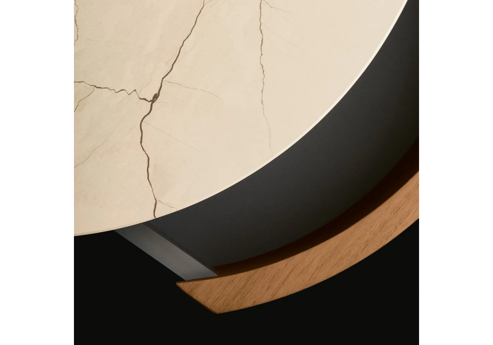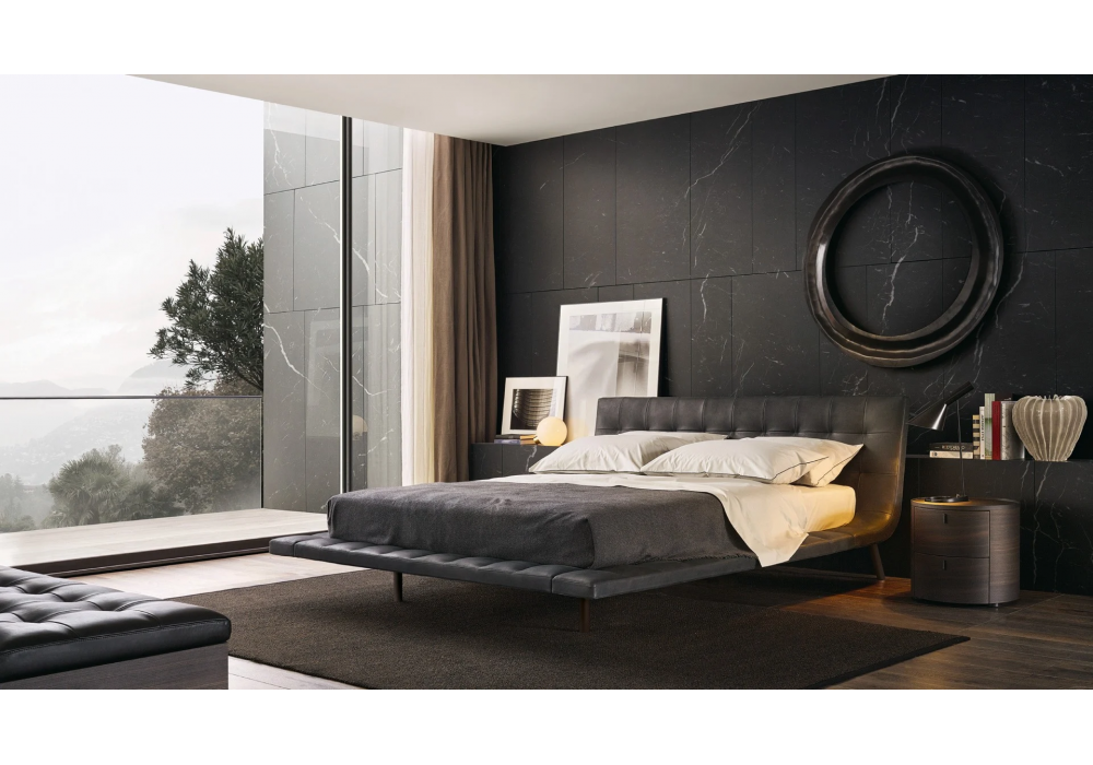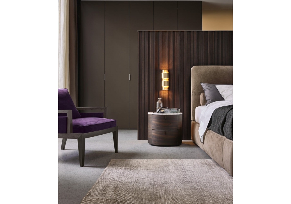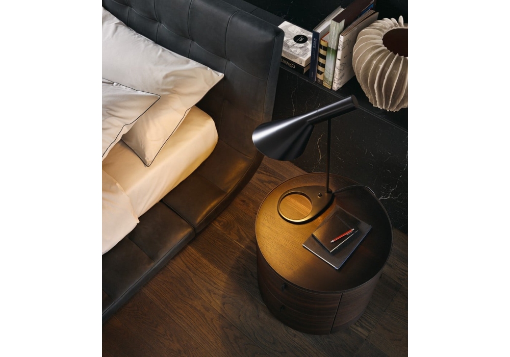 Onda conçue par R&D Poliform est une table de chevet en bois. Tiroirs avec poignées en croûte de cuir. Top disponible en laqué mat, revêtu en croûte de cuir ou marbre mat/brillant.