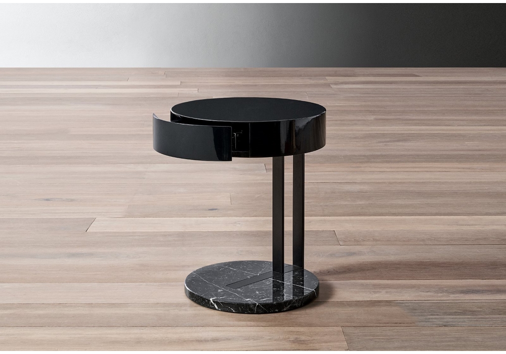 Ralf conçu par Andrea Parisio pour Meridiani est un chevet avec tiroir et structure en métal. Plateau en bois laque mate ou brillante. Base en marbre.