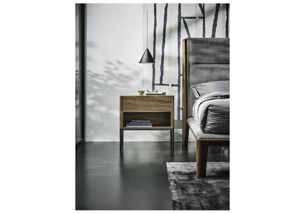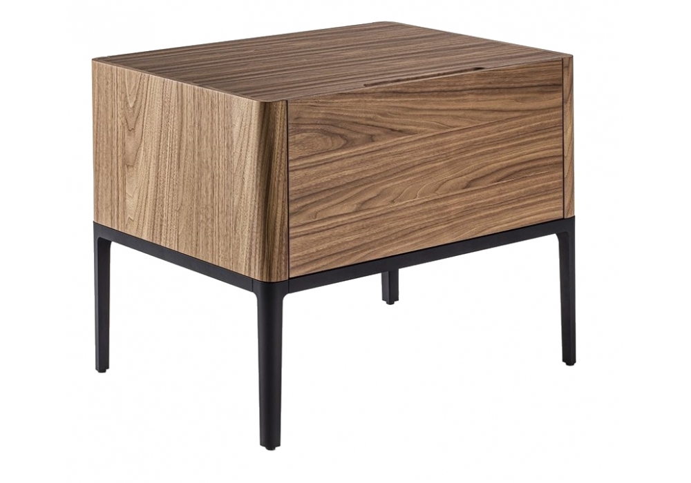 Nara conçue par D. Dolcini pour Porada est une table de chevet en noyer canaletta avec un tiroir ou un tiroir et un compartiment ouvert. Base en métal noir mat en aluminium moulé sous pression.
