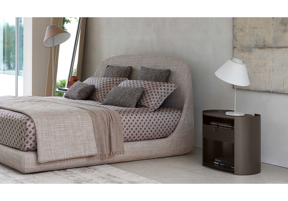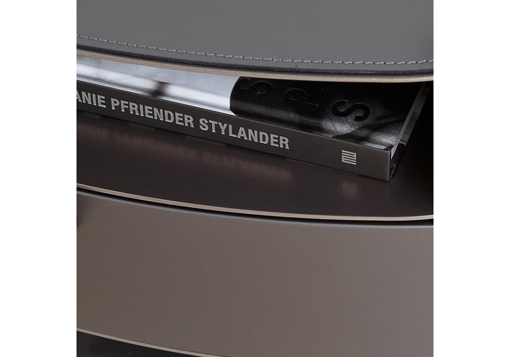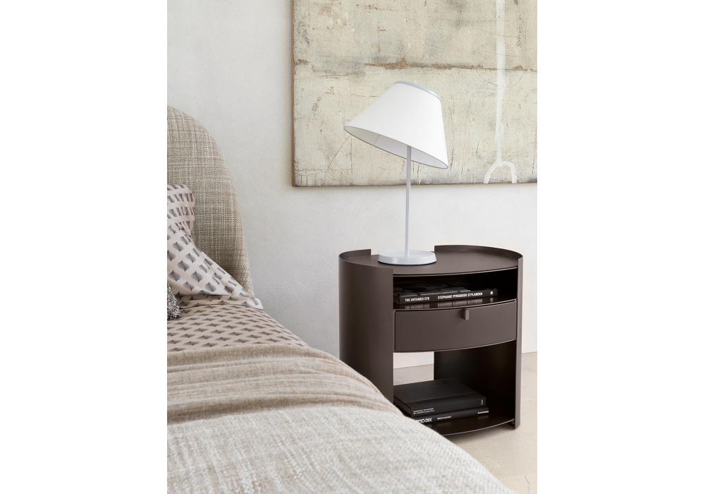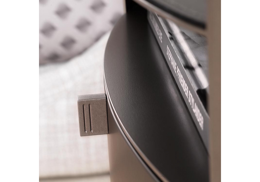 Lotus conçue par Emanuela Garbin pour Flou est une table de chevet avec un tiroir et trois plateaux de support. Structure en métal disponible en plusieurs finitions. Tiroir avec partie frontale en bois, poignées en métal dans la même finition que la structure. Le profil surélevé du plateau supérieur peut être complété par un tapis en cuir assorti aux couleurs de la structure.