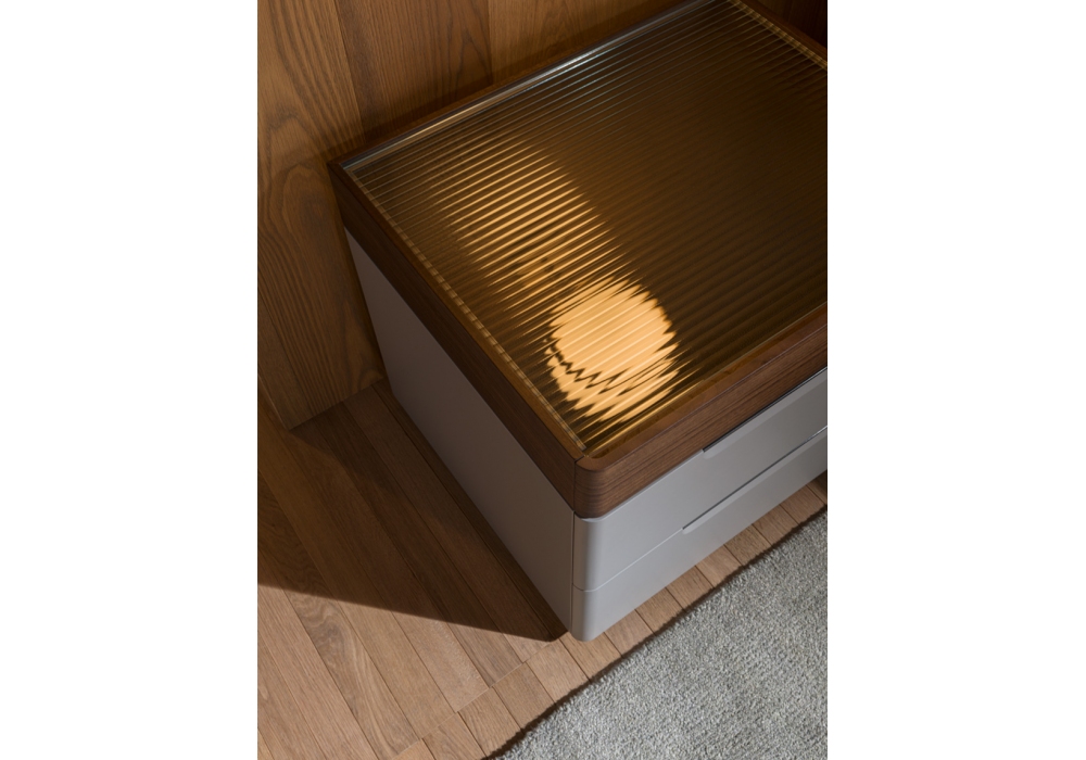 7070 conçue par Rodolfo Dordoni pour Molteni&C est une table de chevet avec structure laquée mate et plateau en bois d'eucalyptus ou marbre. Le plateau coulissant de la table de chevet est en eucalyptus avec un plateau en verre Flutes, il est également possible d'insérer un fond en Eco Skin marron foncé. Disponible en différentes finitions et modèles.