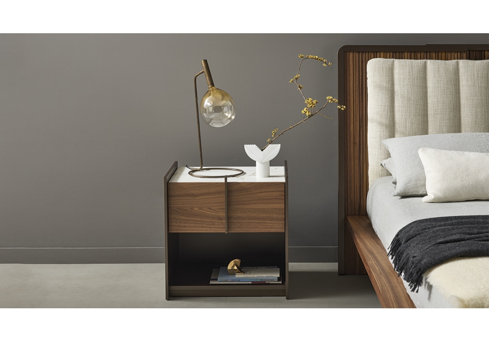 Aureo conçue par Matteo Nunziati pour Bonaldo est une table de chevet avec plateau en céramique, en différentes finitions. Les tiroirs sont en bois plaqué noyer canaletto, la structure latérale est en métal peint bronze et la structure latérale est en bois laqué bronze mat.