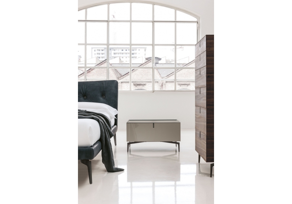 Meridien conçue par Giuseppe Bavuso pour Alivar est une table de chevet réalisée avec structure en MDF laqué mat ou en chêne verni ou traité thermiquement. Tiroirs avec guides métalliques de freinage. Façade en MDF laqué mat ou en chêne verni ou traité thermiquement. Poignées en métal. Plateau et base en acier peint.