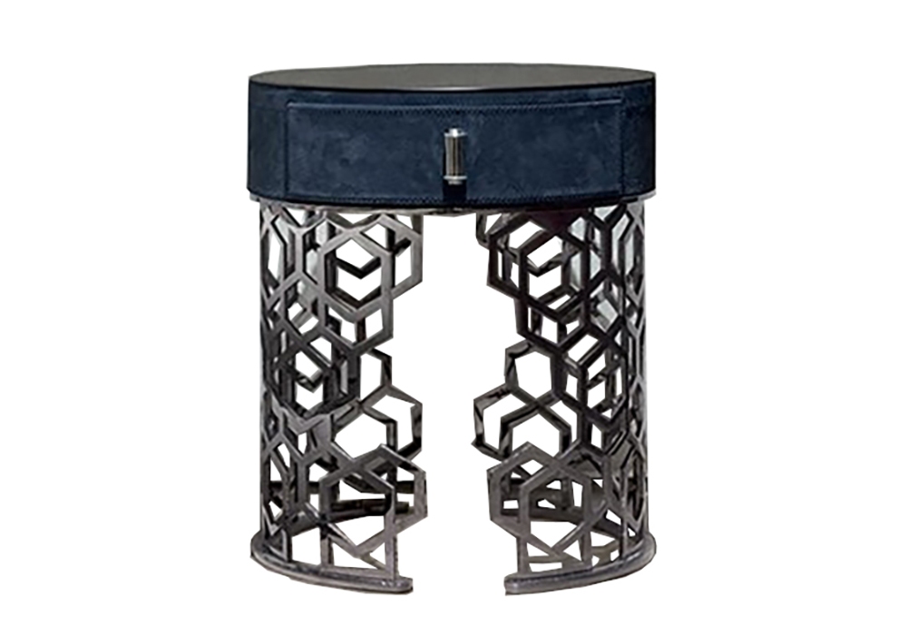 Lucy conçue par Giuseppe Iasparra pour Longhi est une table de chevet avec 1 tiroir recouvert de cuir et base travaillée en métal rectifié découpé au laser avec décoration "Sequence" et calandrée. Plateau en marbre, miroir ou cristal.
