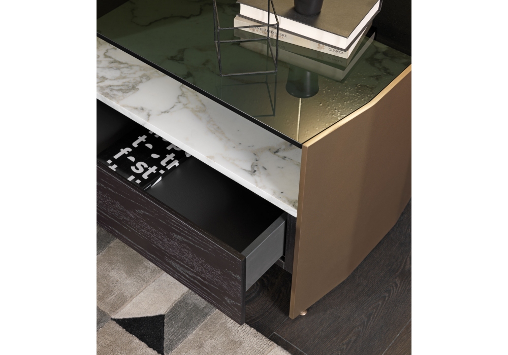 Milvian conçue par Francesco Lucchese pour MisuraEmme est une table de chevet avec plateau en verre et tiroir en bois avec plateau en marbre ou en bois. Épaules en aluminium peint. Disponible en 2 dimensions et dans les versions : murale ou double face.