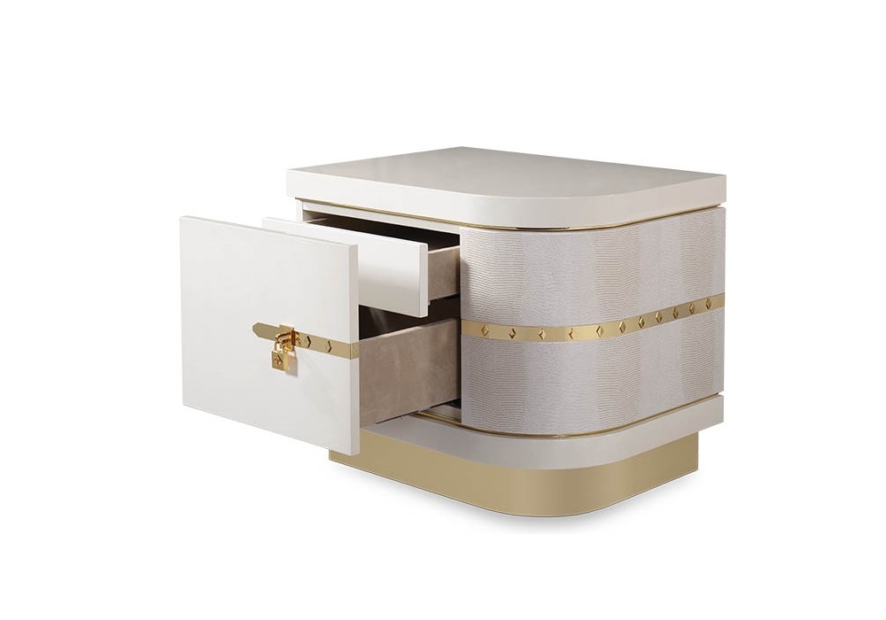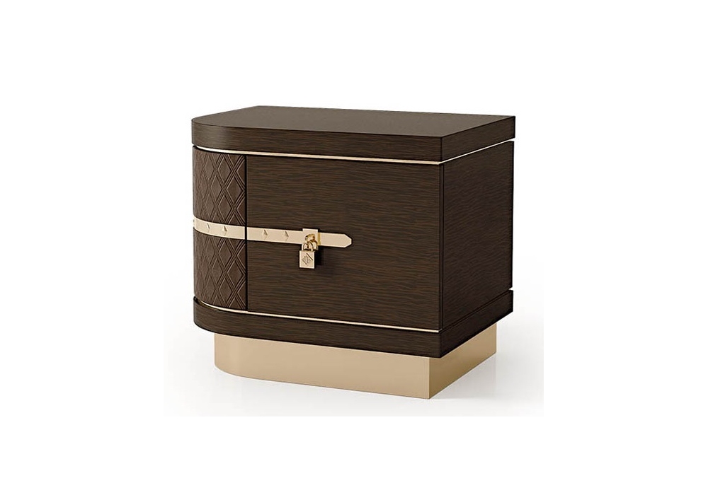 Diamond conçue par Giovanni Cagnato pour Turri est une table de chevet avec structure et plateau en MDF, contreplaqué et panneaux de particules en finition brillante, base et détails en métal doré. Revêtement en différents cuirs. Disponible en version droite ou gauche