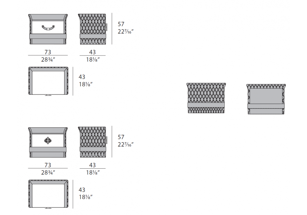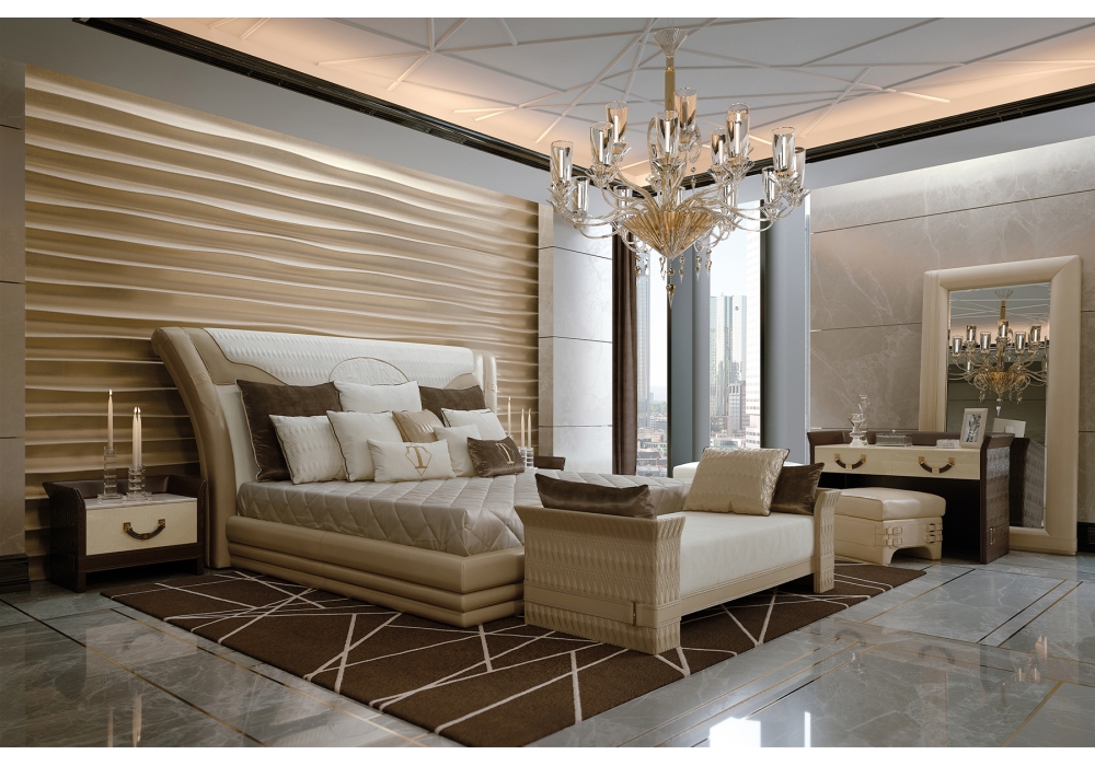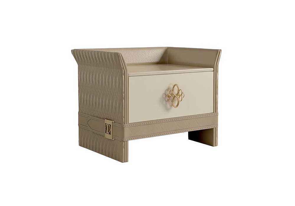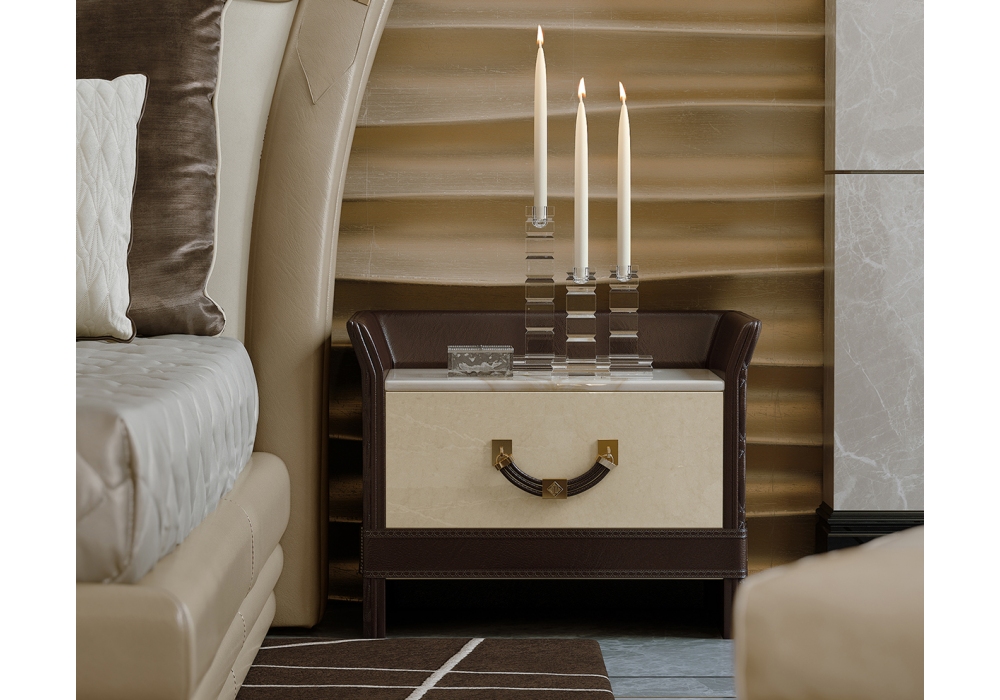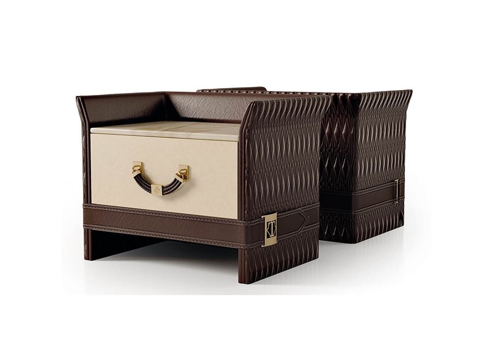 Numero Tre conçue par Roberto Serio pour Turri est une table de chevet avec structure en MDF, bois massif, contreplaqué et panneaux de particules en finition laquée brillante avec dossier entièrement ou partiellement recouvert de cuir brodé. Plateau en marbre ou bois. Disponible avec poignées en cuir ou en métal.