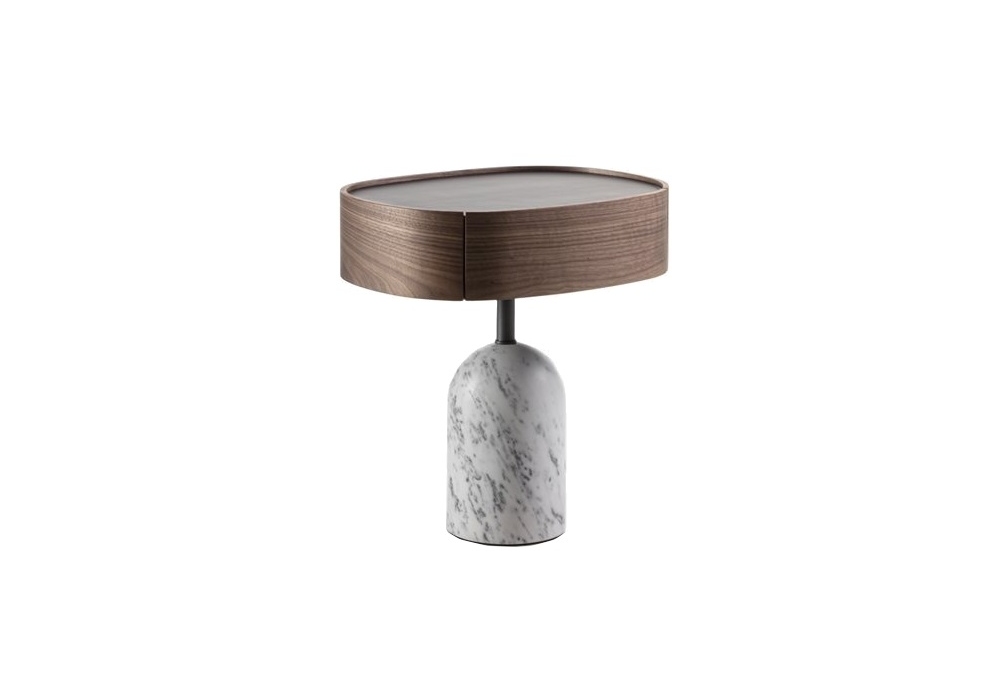 Ekero Night conçue par Tollgard & Castellani pour Porada est une table de chevet avec base cylindrique en marbre blanc de Carrare ou gris Carnico, tige centrale en métal finition gris étain et tiroir supérieur en bois. Plateau en bois ou recouvert de cuir Cuoietto. Intérieur du tiroir en finition titane anti-rayures.