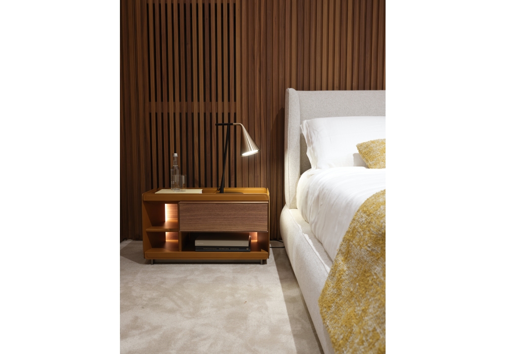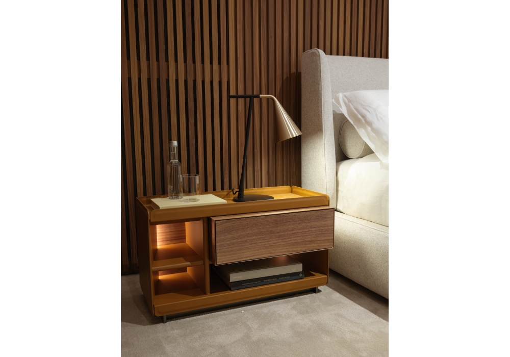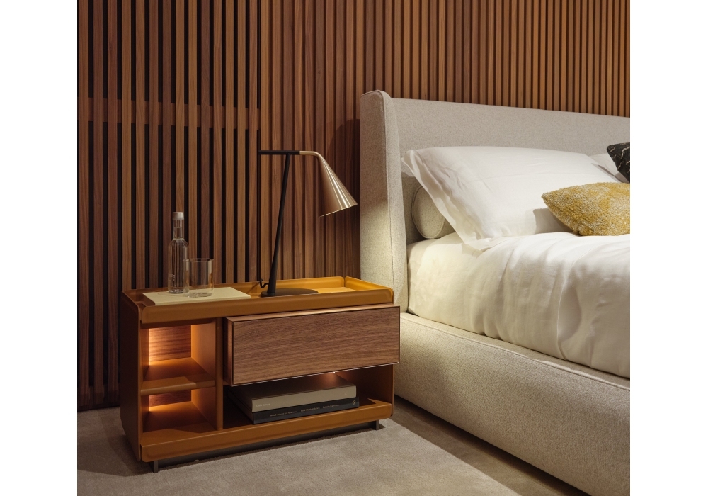 Perfect Days conçue par Mauro Lipparini pour Conte Casa est une table de chevet réalisée avec une structure recouverte de cuir et des détails en bois. Disponible en différentes finitions.