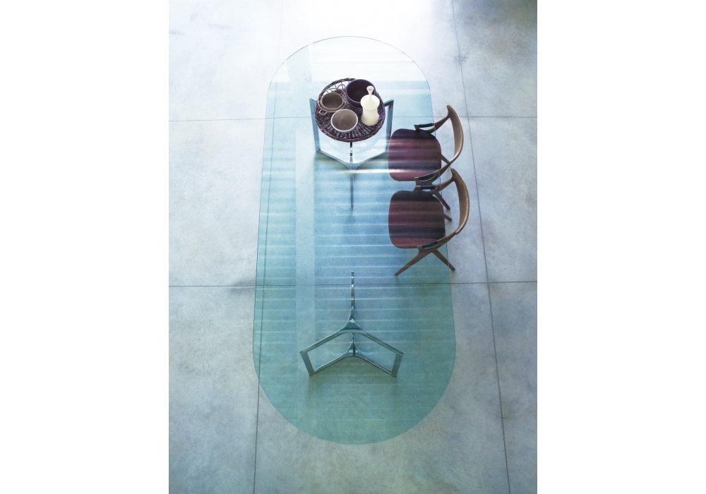 Raj Light conçue par Ricardo Bello Dias pour Gallotti&Radice est un table avec plateau en verre transparent. Acier inox brillant. Partie centrale en aluminium chromé.