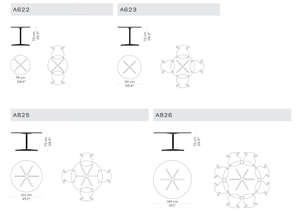 | Plateau | Ø 75 cm; Ø 90 cm; Ø 120 cm; Ø 145 cm. |