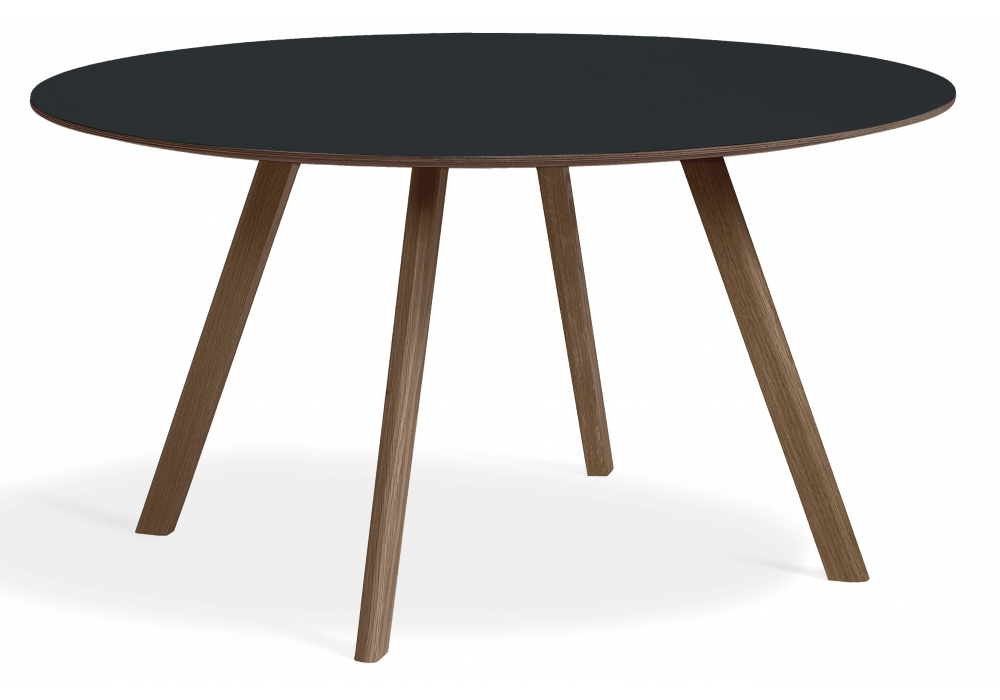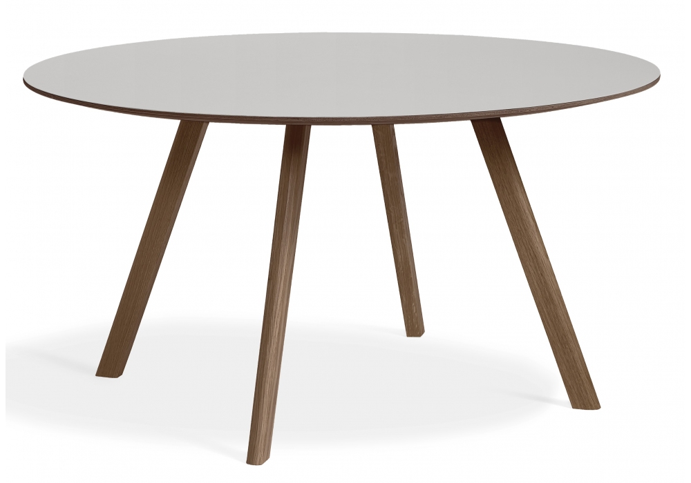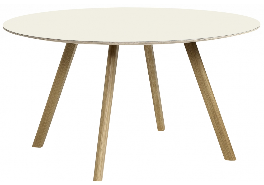 Copenhague Round Table CPH 25 conçue par Ronan et Erwan Bouroullec pour Hay est une table avec plateau en contreplaqué avec stratifié, linoléum ou placage en différentes finitions. Le bord du plateau de table correspond à la finition de la base. Pieds en bois massif avec vissage intégré non visible. Pieds extensibles réglables pour niveler la table sur des surfaces inégales. Disponible en différentes finitions.