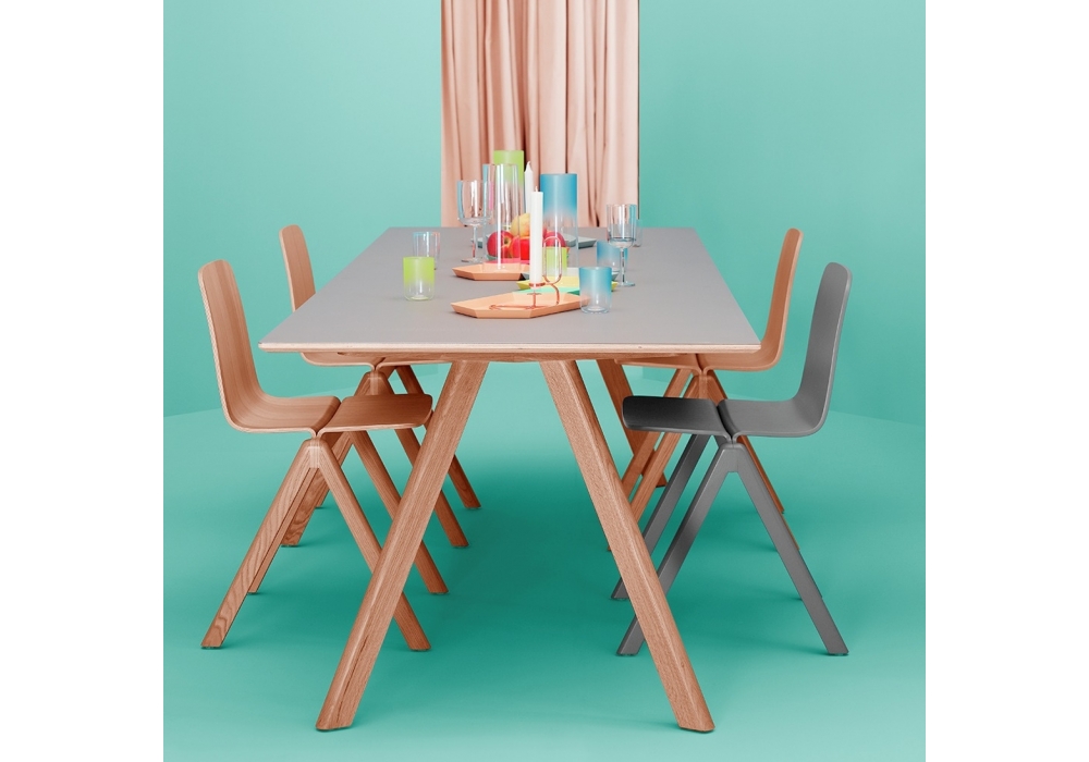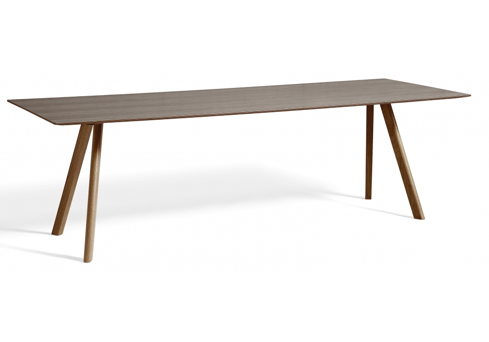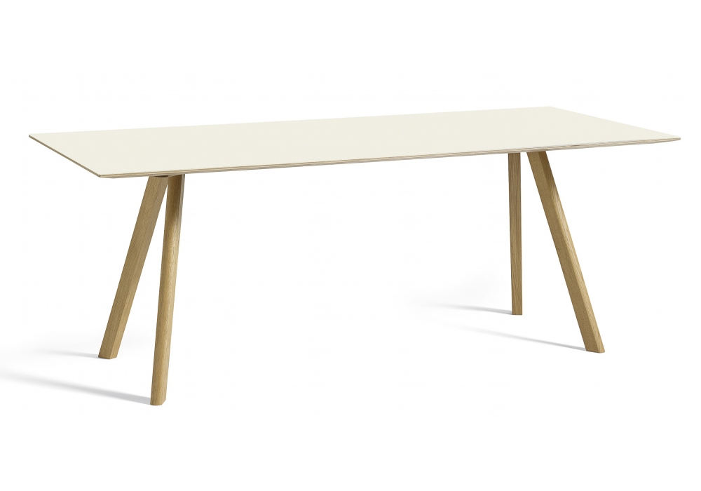 Copenhague CPH 30 conçue par Ronan et Erwan Bouroullec pour Hay est une table avec plateau en contreplaqué avec stratifié, linoléum ou placage en différentes finitions. Le bord du plateau de table est biseauté et correspond à la finition de la base. Pieds bois inclinés équipés de vis invisibles intégrées. Pieds réglables extensibles pour niveler la table sur des surfaces inégales. Disponible en différentes dimensions et finitions.