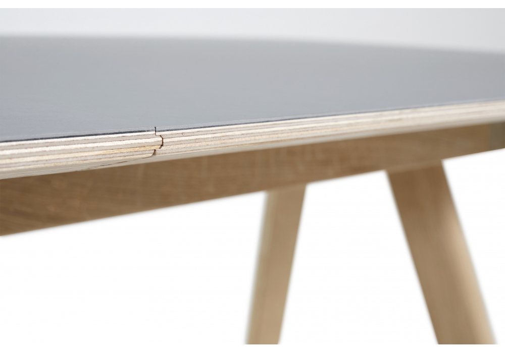CCopenhague CPH 30 conçue par Ronan et Erwan Bouroullec pour le foin est une table extensible avec un haut en contreplaqué avec stratifié, linoléum ou placage dans différentes finitions. Le bord du dessus de la table correspond à la finition du cadre. Connects en bois massif incliné avec connexion à vis invisible intégrée et pieds réglables extensibles pour niveler la table sur des surfaces inégales. Disponible dans différentes dimensions et finitions.