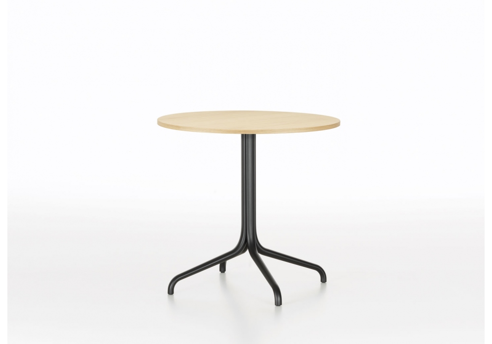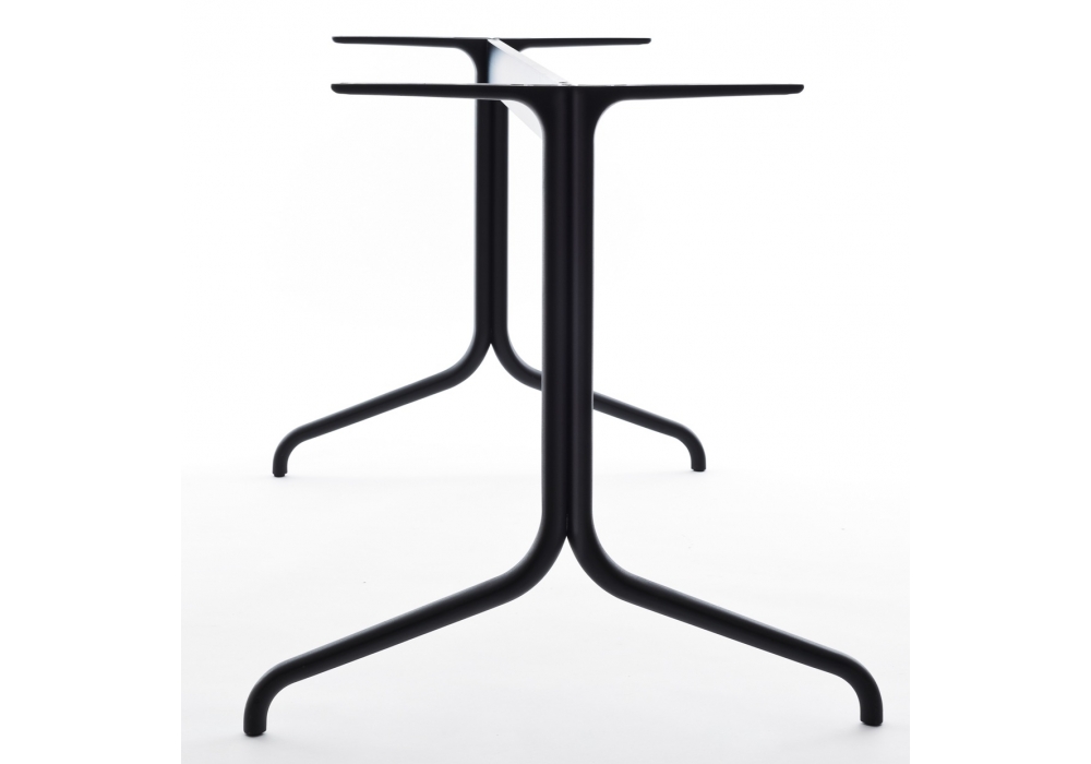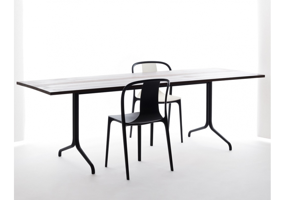 The colour and surface texture of the cast aluminium table legs, which have a black powder-coated finish, are nearly indistinguishable from the polyamide frame of the Belleville Chair. And since the materials of the table tops and seat shells are either identical or harmoniously coordinated, the tables and chairs form a unified yet diverse group – a hybrid family of furnishings whose materiality resists classification.