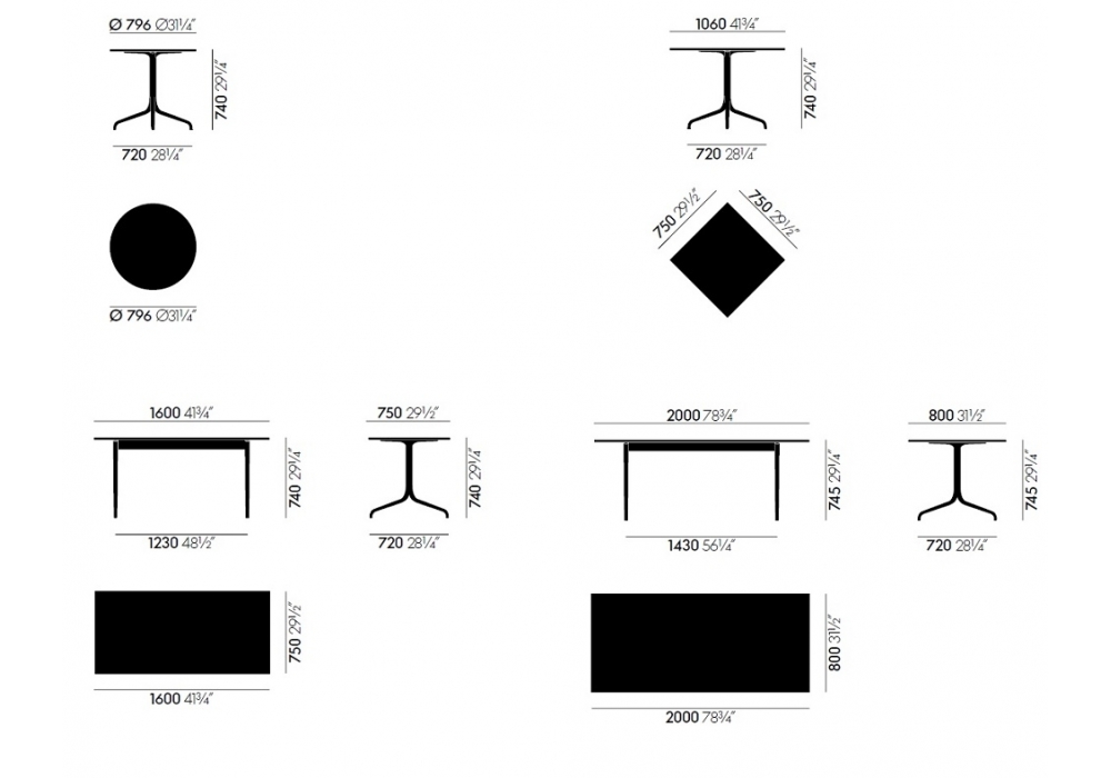 Belleville Table designed by Ronan & Erwan Bouroullec for Vitra is a tables collection. The Belleville Tables reveal a similar capacity for transformation, featuring table tops in laminate, wood or stone, along with elegantly arched legs of cast aluminium. The Belleville Tables are modelled on the typology of the classic bistro table. The slender legs flow in a continuous sweeping line from their splayed bottom along the central column to the table top. Forming star- or t-shaped bases, they can be arranged as graceful dining tables, single bistro tables or long cafeteria tables.