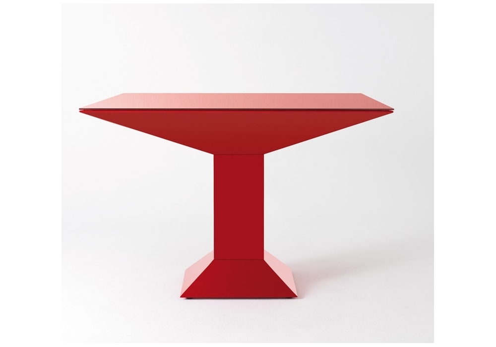 Mettsass conçue par Ettore Sottsass Jr. pour BD Barcelona est une table en tôle d'acier plate, peinte en rouge, le verre est peint de la même couleur que la structure.