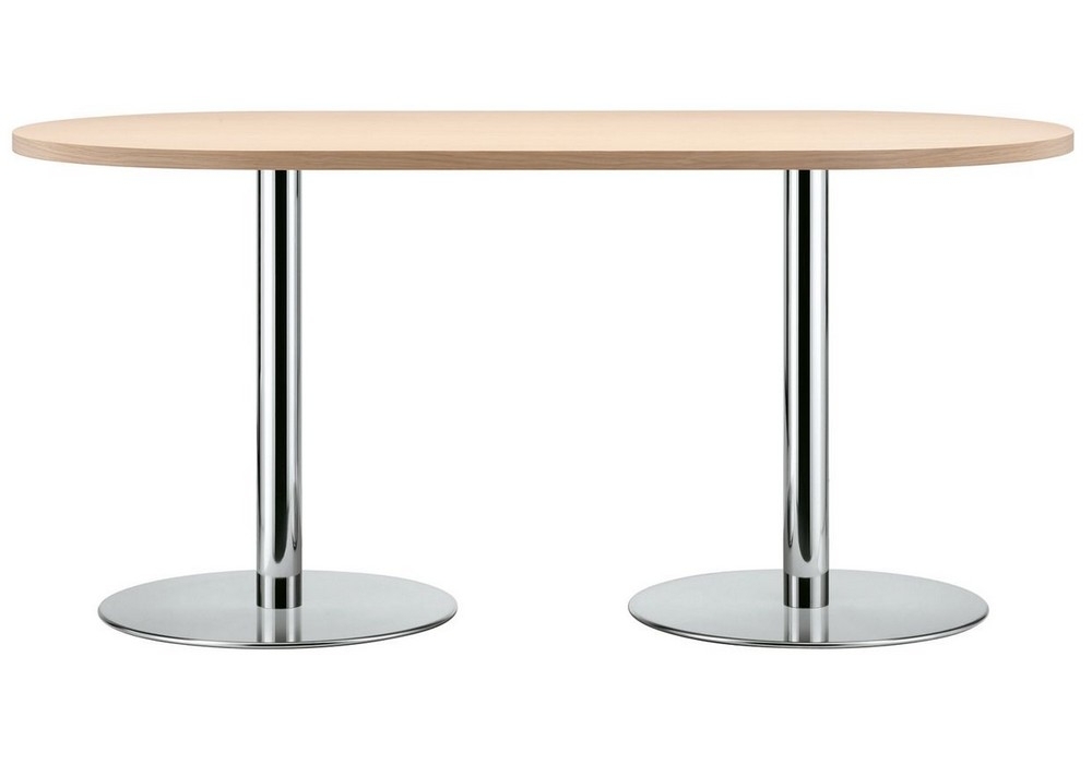 S 1124 conçue par James Irvine pour Thonet est une table ovale avec structure en acier tubulaire chromé ou peint électrostatiquement en noir ou blanc. Dessus en panneau latté avec placage en bois véritable ou stratifié. Disponible en différentes tailles.