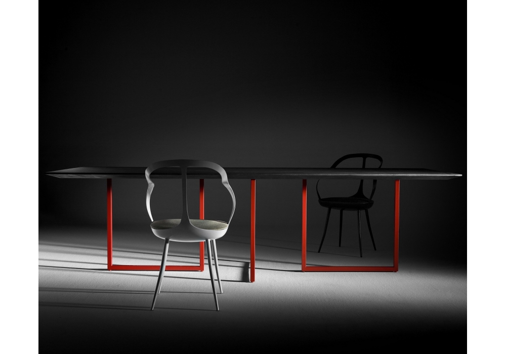 Gazelle conçue par Park Associati pour Driade est une table avec structure en tube d'acier peint en trois couleurs: noir, blanc et rouge. Plateau en mdf sp. 40 millimètres. avec finition en béton ou argile couleur champagne ou en stratifié blanc. Usage interne uniquement. Disponible en différentes tailles.