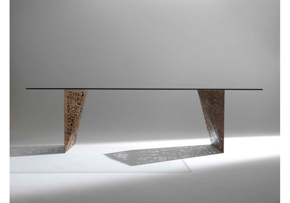Riddled conçue par Steven Holl pour Casamania & Horm est une table réalisée avec plateau en verre trempé. Pieds en bois d'origami en noyer Canaletto breveté Horm, gravés au laser. Système optionnel de lumières LED.