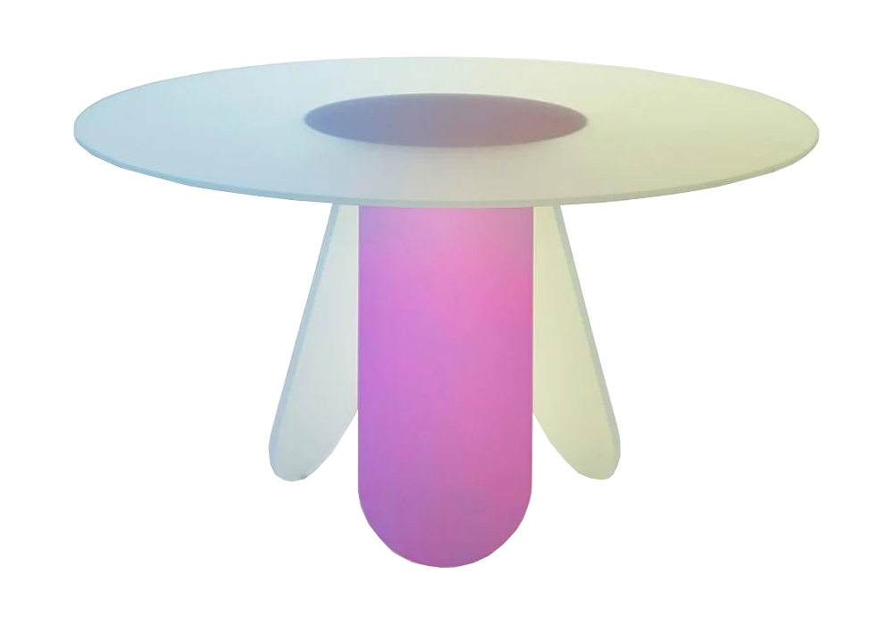 Shimmer conçue par Patricia Urquiola pour Glas Italia est une belle table en cristal stratifié et collé, avec une finition spéciale changeante multichromatique, dont la couleur varie en fonction de l’angle d’incidence de la lumière et du point d’observation. Il en résulte des objets à l’aspect magique et aérien. Disponible en plusieurs dimensions.