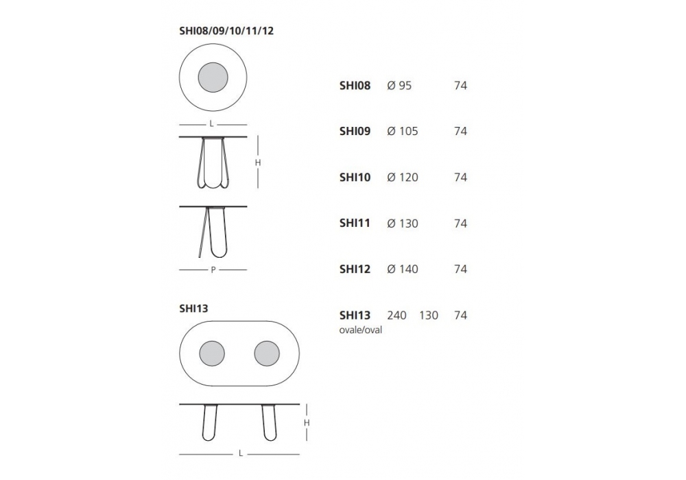 | Dimensions | SHI08_ Ø 95 x H 74 cm; SHI09_ Ø 105 x H 74 cm; SHI10_ Ø 120 x H 74 cm; SHI11_ Ø 130 x H 74 cm; SHI12_ Ø 140 x H 74 cm; SHI13_ 240 x 130 x H 74 cm. |