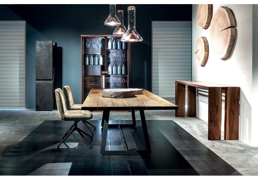Calle Cult Natural Sides conçue par Aldo Spinelli pour Riva 1920 est une table composée d'un plateau en bois massif à listes juxtaposées avec des bords naturels, combiné à une structure en fer composée de deux pieds traîneau et d'une barre centrale.