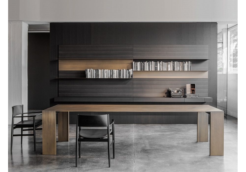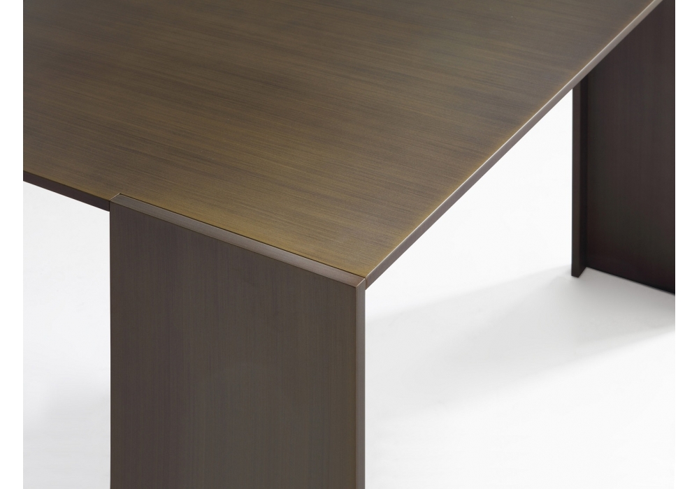 Metallico designed by Piero Lissoni for Porro is a table characterized by the lightness of top and legs, made of aluminium sheet, 12 mm thick. The solid aluminium gives to this essential project with delicate aesthetics but materially consistent as well, solidity and lightness, besides being ecological. Suitable for living and meetings rooms as well, it is available in four different colours: black "metallico", burnished brass, white "metallico" and antique red.