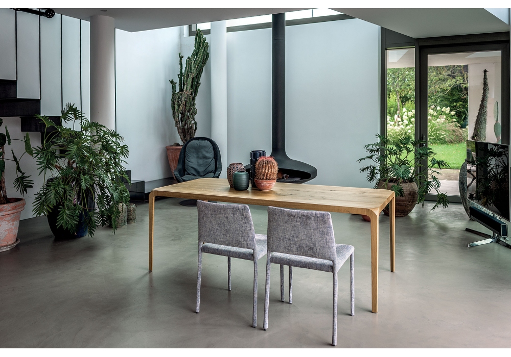 Sleek conçue par Karim Rashid pour Riva 1920 est une table entièrement en bois massif avec un plateau à planches collées sur lequel les quatre pieds s'emboîtent au moyen d'un système particulier de queue d'aronde.
