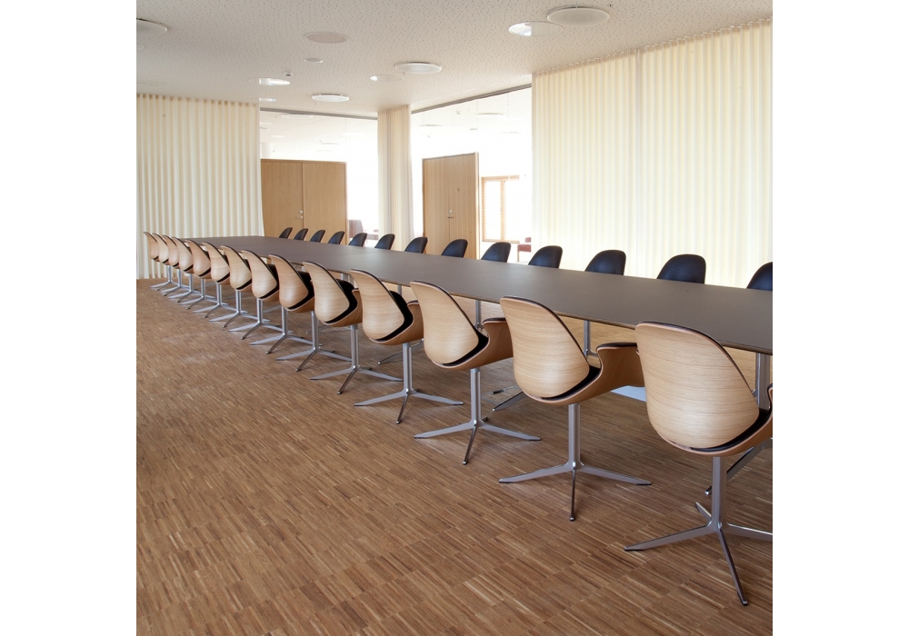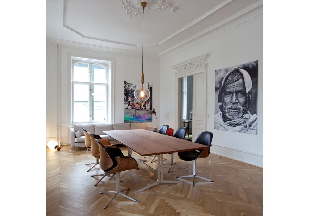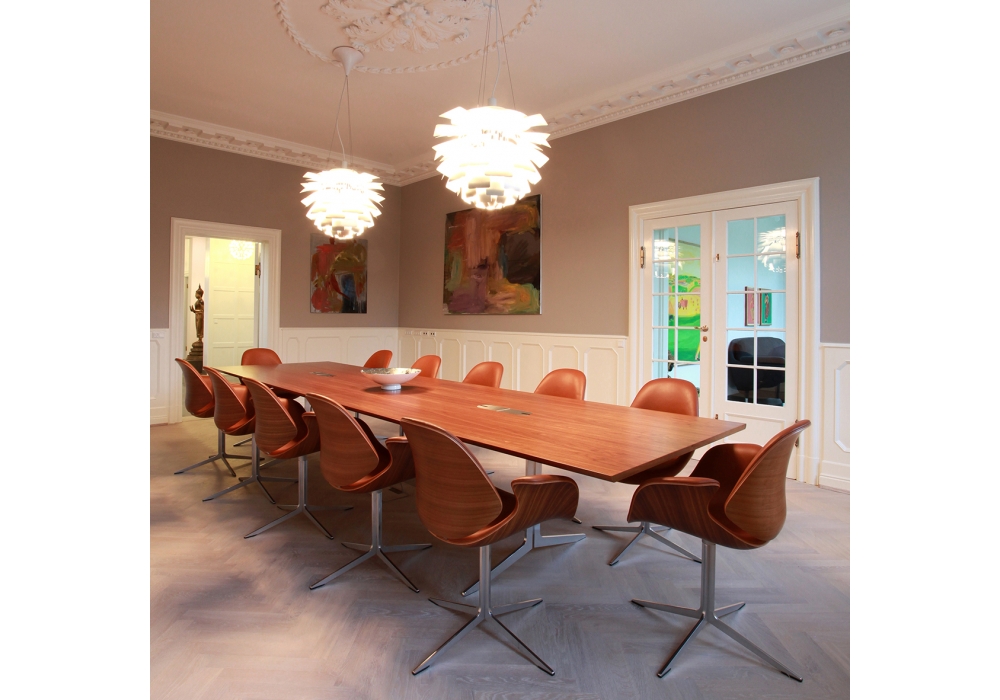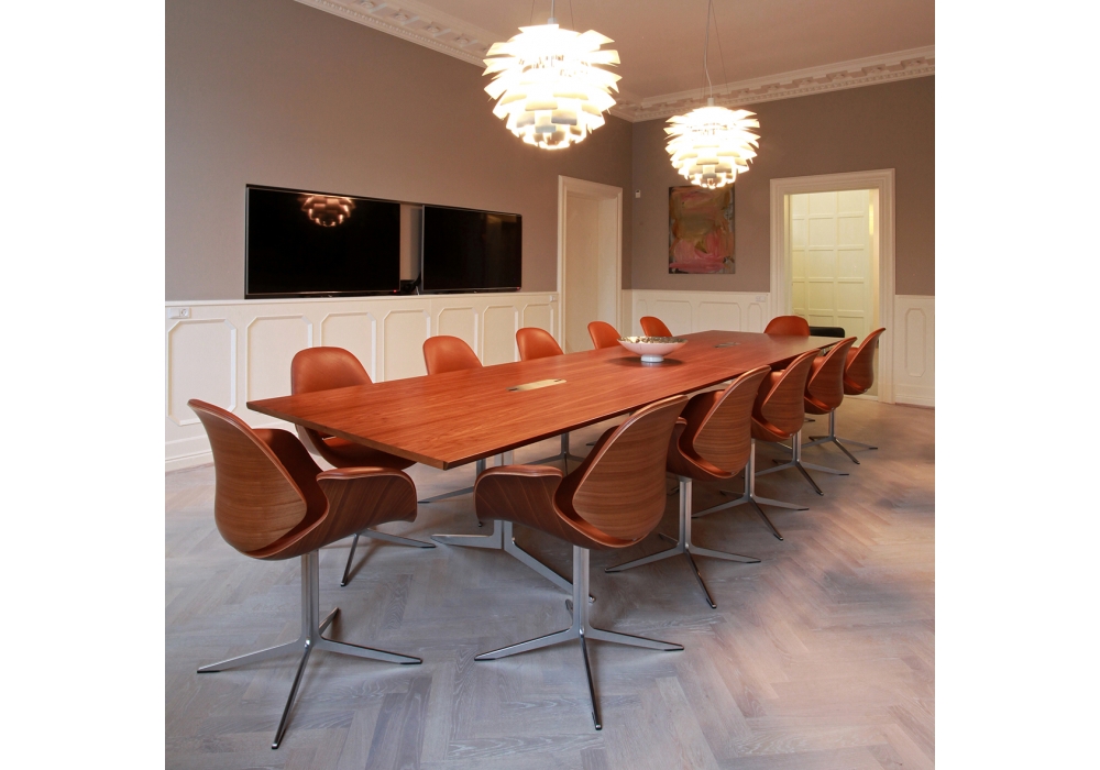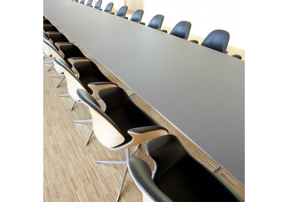 Council Table conçue par Salto & Sigsgaard pour OneCollection est une belle table avec plateau disponible en bois de placage ou linoléum et jambes en aluminium poli. Également disponible en 3 différentes dimensions et 2 modèles.