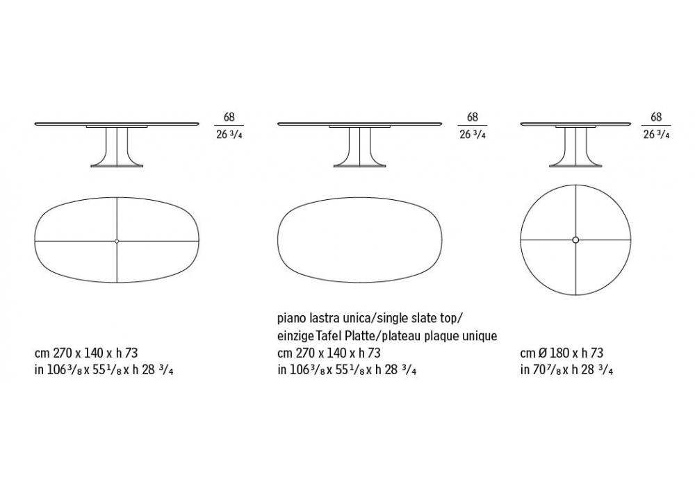 | Dimensions | 270 x 140 x H 73 cm; Ø 180 x H 73 cm. |
