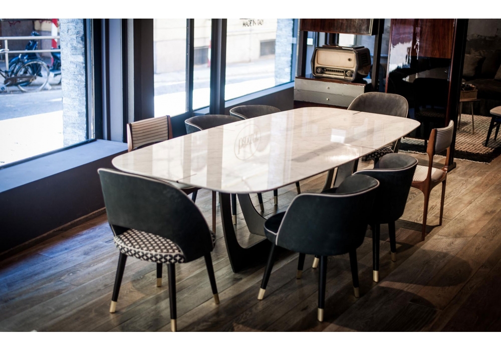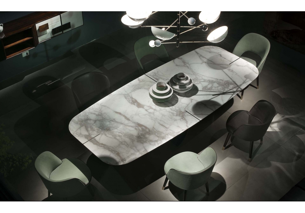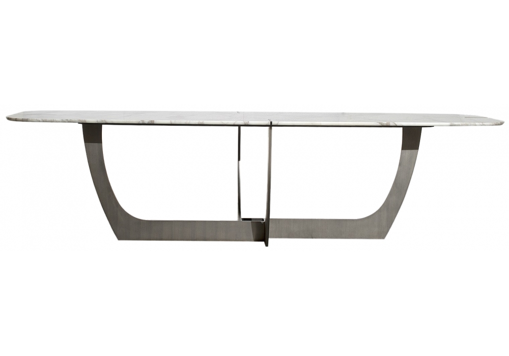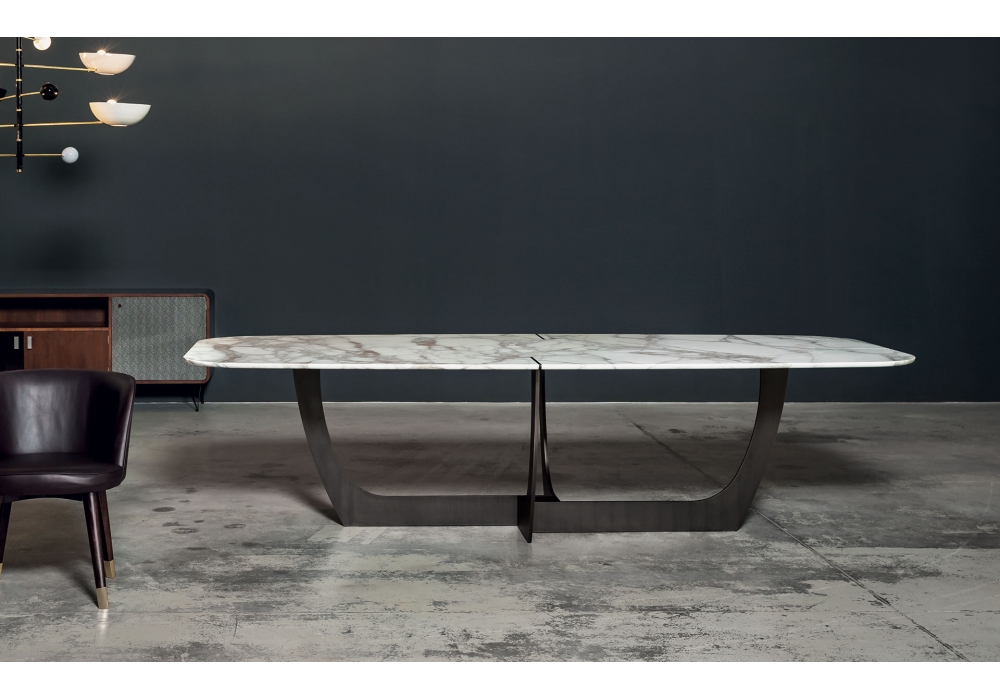 Romeo conçue par Roberto Lazzeroni pour Baxter est une belle table avec base en métal satiné revêtu de laiton, en métal bruni fini à main ou en métal nickelé avec vernis mat, coupée au laser de 1,5 cm ½" d'épaisseur. Plateau de pierre ou en bois recouvert de cuir avec des inserts décoratifs suite à la finition et le positionnement de la base. Plateaux brillants: marbre Gioia Blanc, marbre Gold Calacatta, granit Elegant Brown, quartzite Geode. Les blocs et les dalles varient visiblement car ce sont des pierres naturelles; toutes les images sont un guide approximatif.