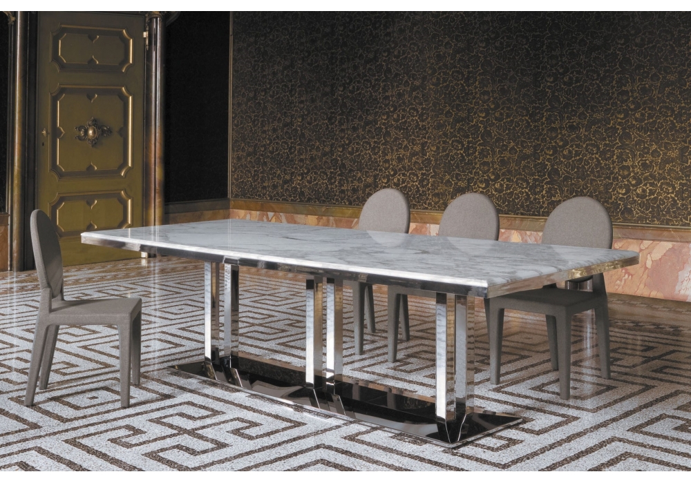 Artù conçue par Giuseppe Viganò pour Longhi est une table avec structure en métal rectifié découpé au laser et plateau en marbre, cristal ou miroir. Disponible en différentes finitions et dimensions.