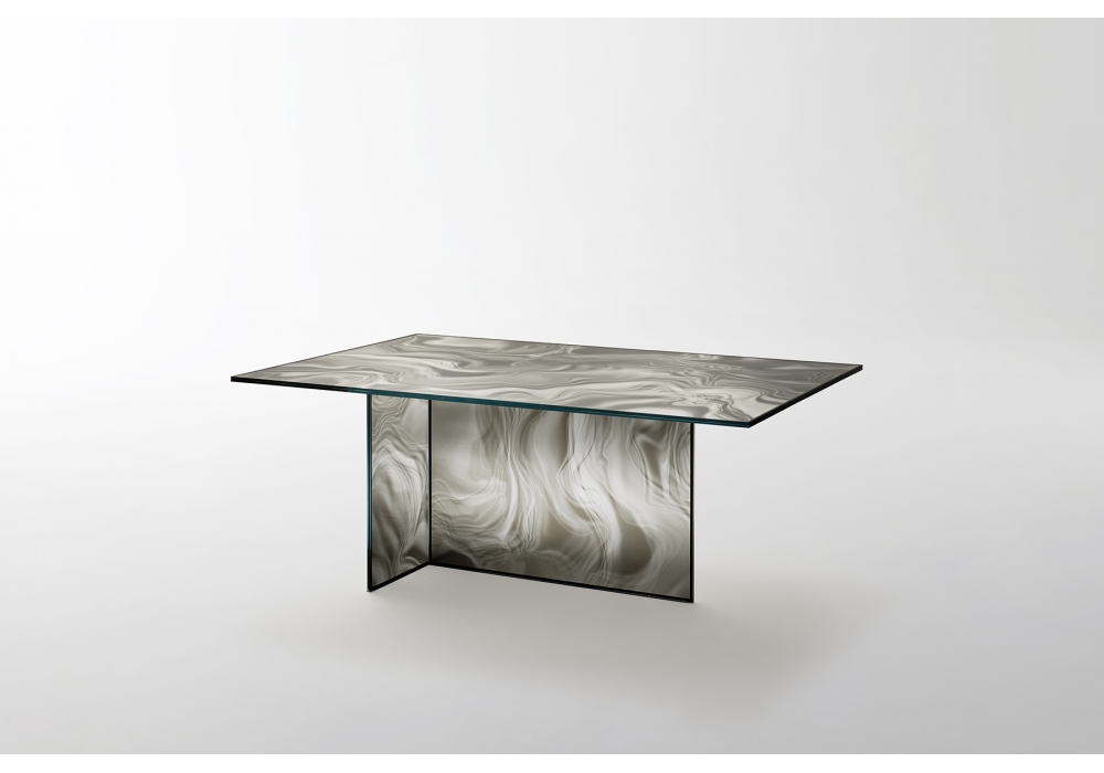 Liquefy conçue par Patricia Urquiola pour Glas Italia est une table en cristal transparent extralight trempé, avec une décoration qui ressemble au marbre. Grâce à un effet surprenant, les veines semblent dynamiques et variables dépendent du point d'observation. Disponible en différentes finitions.