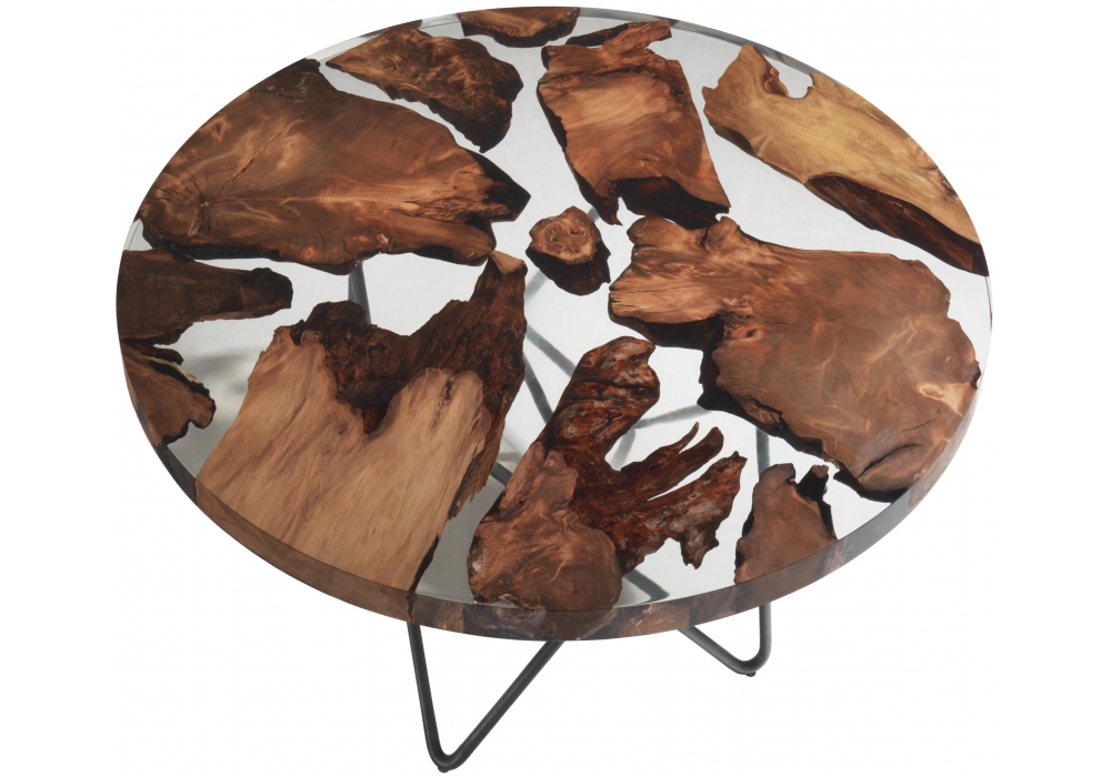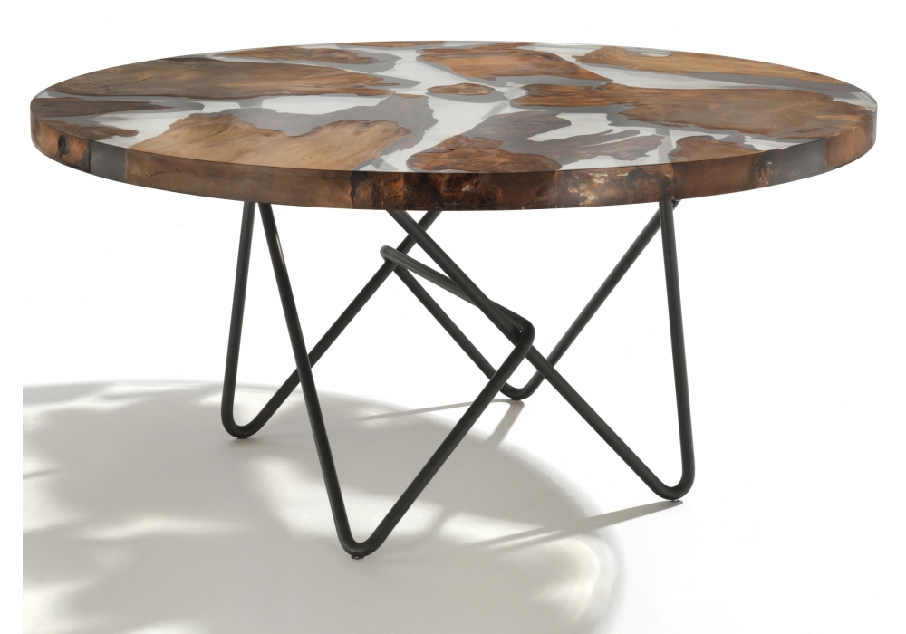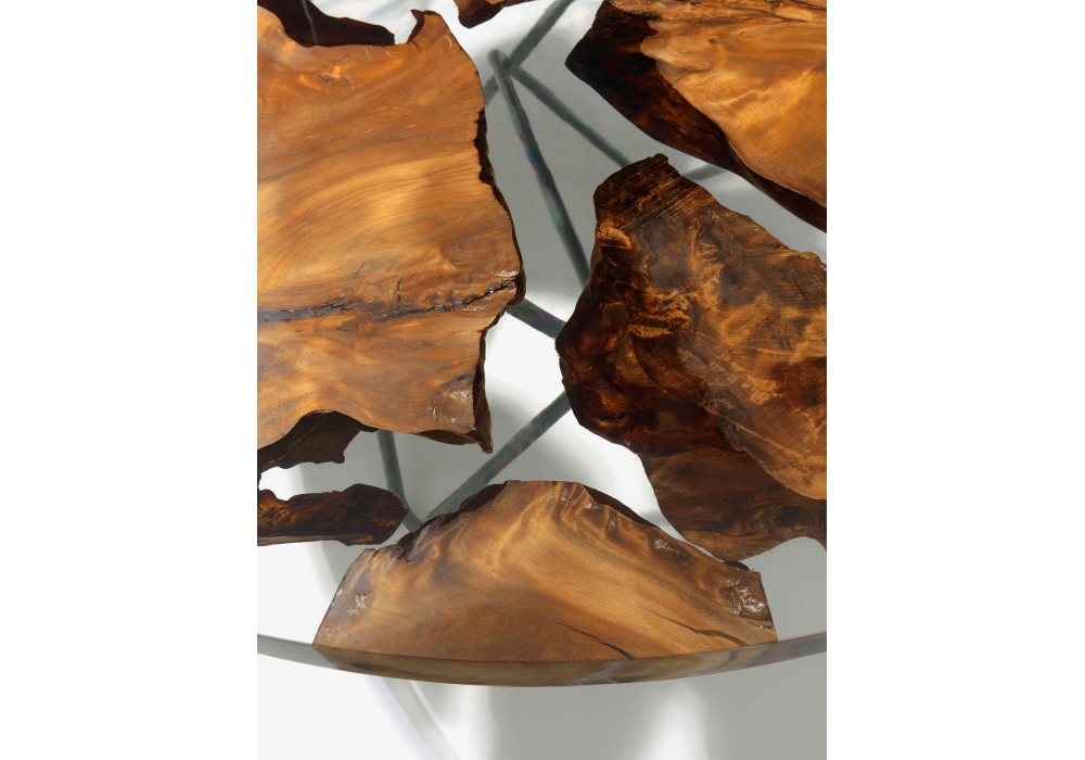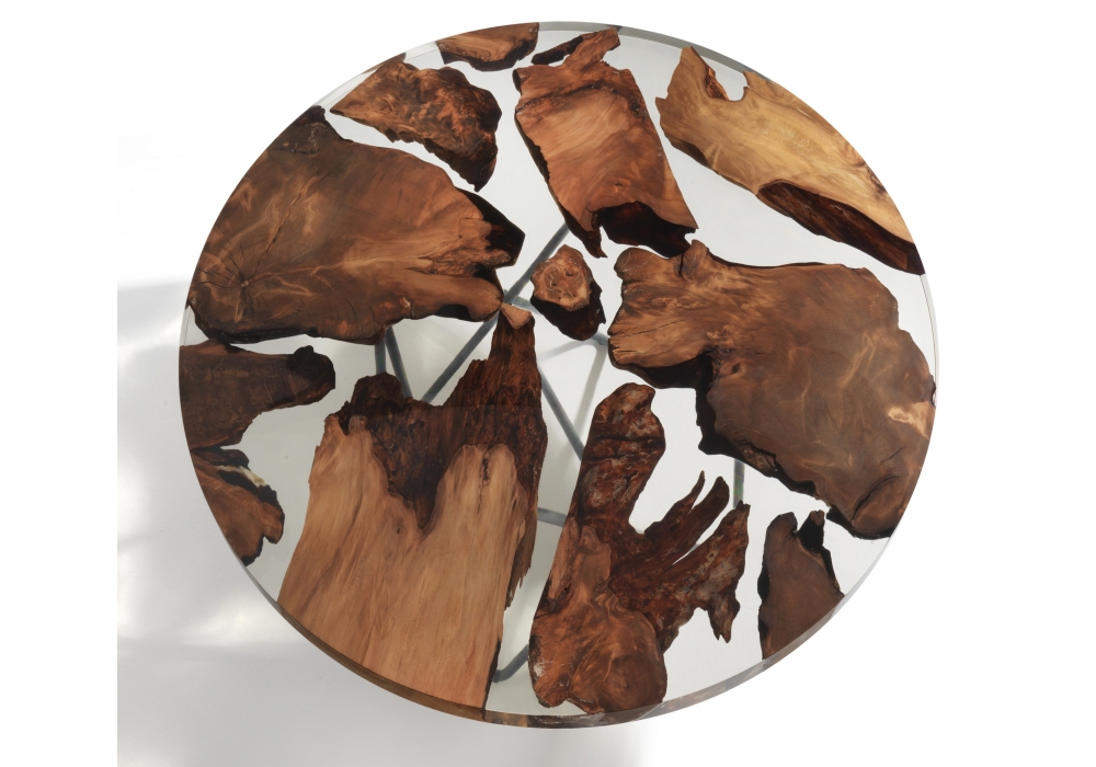 Kauri Earth conçue par C.R. & S. Riva 1920 et Renzo & Matteo Piano pour Riva 1920 est une table avec plateau en bois de Kauri et résine, une représentation stylisée du globe terrestre : métaphoriquement les parties en bois représentent les continents et les sections en résine les océans. Base en fer à section tubulaire.