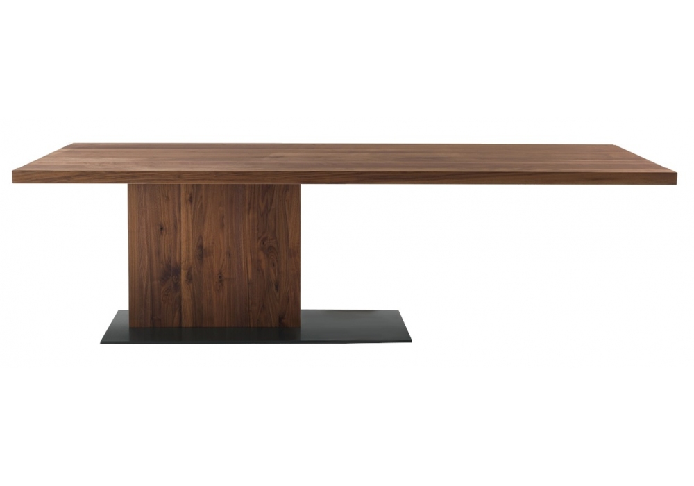Liam Wood conçue par C.R. & S. Riva 1920 est une table entièrement en bois massif avec des planches collées et des côtés carrés, combinée à un pied en bois asymétrique, positionné latéralement, et une plaque de sol en fer.
