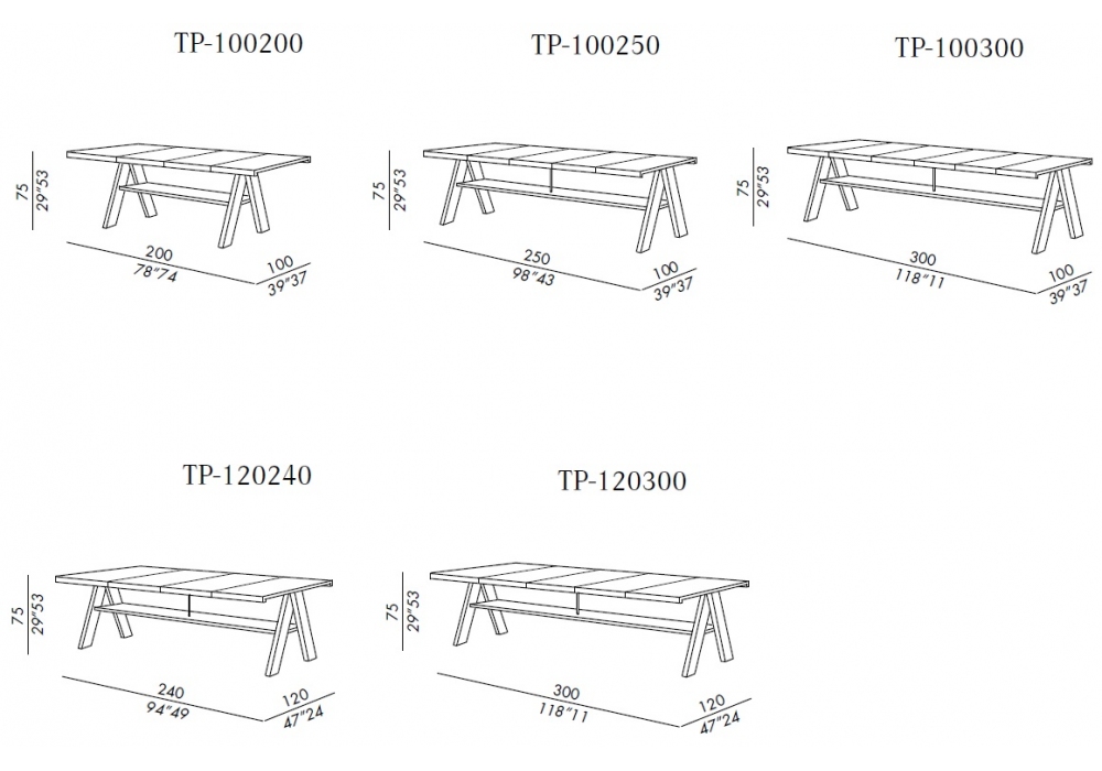 | Dimensions | 200 x 100 x H 75 cm; 250 x 100 x H 75 cm; 300 x 100 x H 75 cm; 240 x 120 x H 75 cm; 300 x 120 x H 75 cm. |