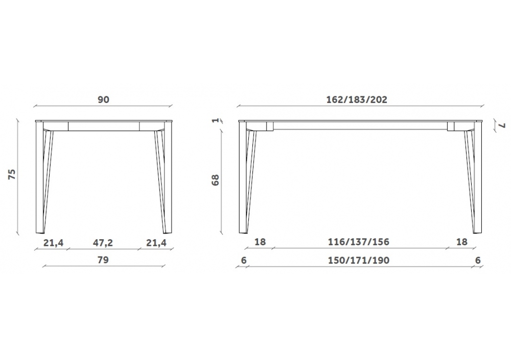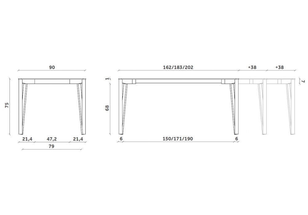 | Dimensions | • 162 x 90 x H 75 cm; • 183 x 90 x H 75 cm; • 202 x 90 x H 75 cm; • 162-200-238 x 90 x H 75 cm; • 183-221-259 x 90 x H 75 cm; • 202-240-278 x 90 x H 75 cm |