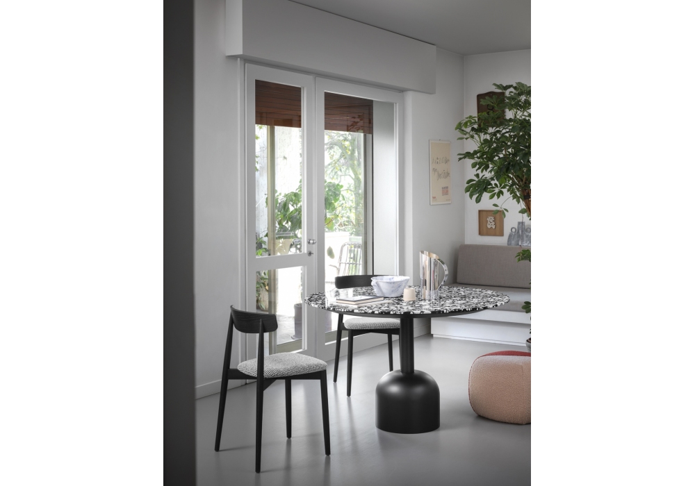 Illo conçue par Miniforms Labs pour Miniforms est une table avec base laquée, colonne centrale en cuivre, or rose mat, galvanisé ou dans la même finition que la base, plateau en céramique ou marbre. Disponible en différentes finitions et tailles.