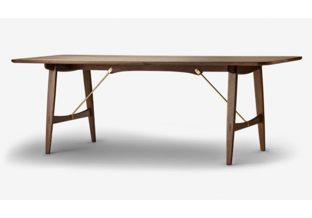 BM1160 Hunting Table conçue par Børge Mogensen pour Carl Hansen & Søn est une table avec structure en chêne massif ou noyer en différentes finitions ou dans la variante chêne / noyer avec pieds en chêne et plateau en noyer. Barres transversales disponibles en acier ou en laiton.