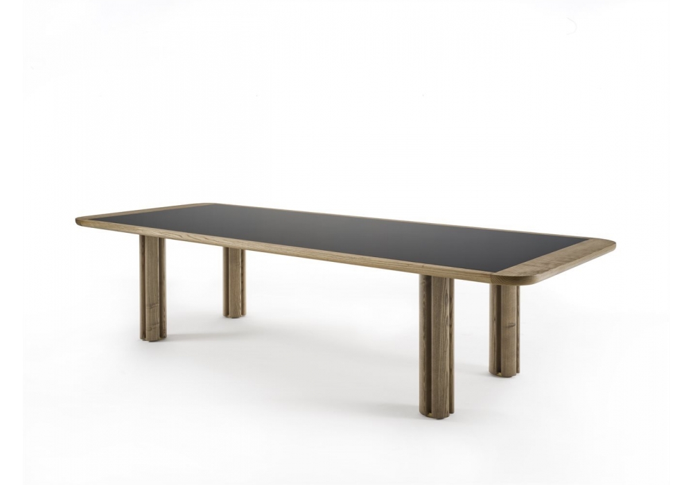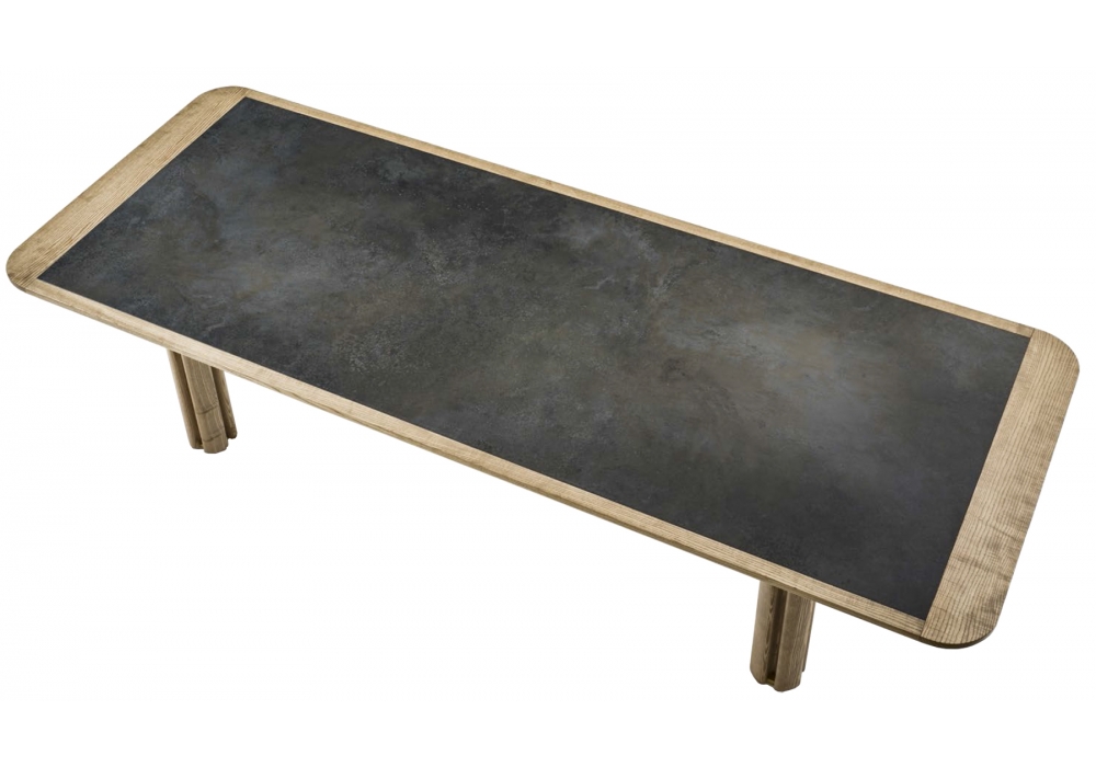 Quadrifoglio conçu par Carlo Ballabio pour Porada est une table en bois avec pieds en laiton et l'intérieur du plateau en pierre ou en verre. Disponible en différentes tailles.