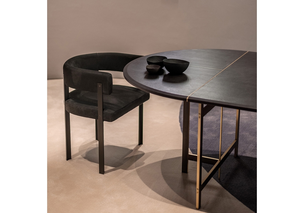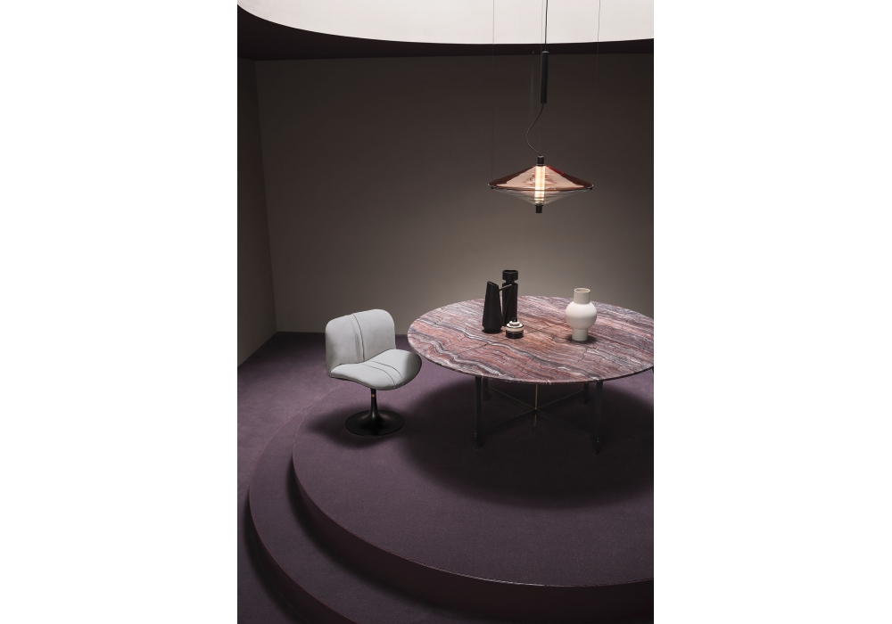 Placé conçue par Federico Peri pour Baxter est une table avec plateau en pierre, disponible en différentes finitions ou recouverts de cuir. Piétement en métal verni avec effet bruni et détails en laiton satiné. Disponible en différentes dimensions. Les tables rondes avec plateau en pierre sont complétées par une Lazy Susan.