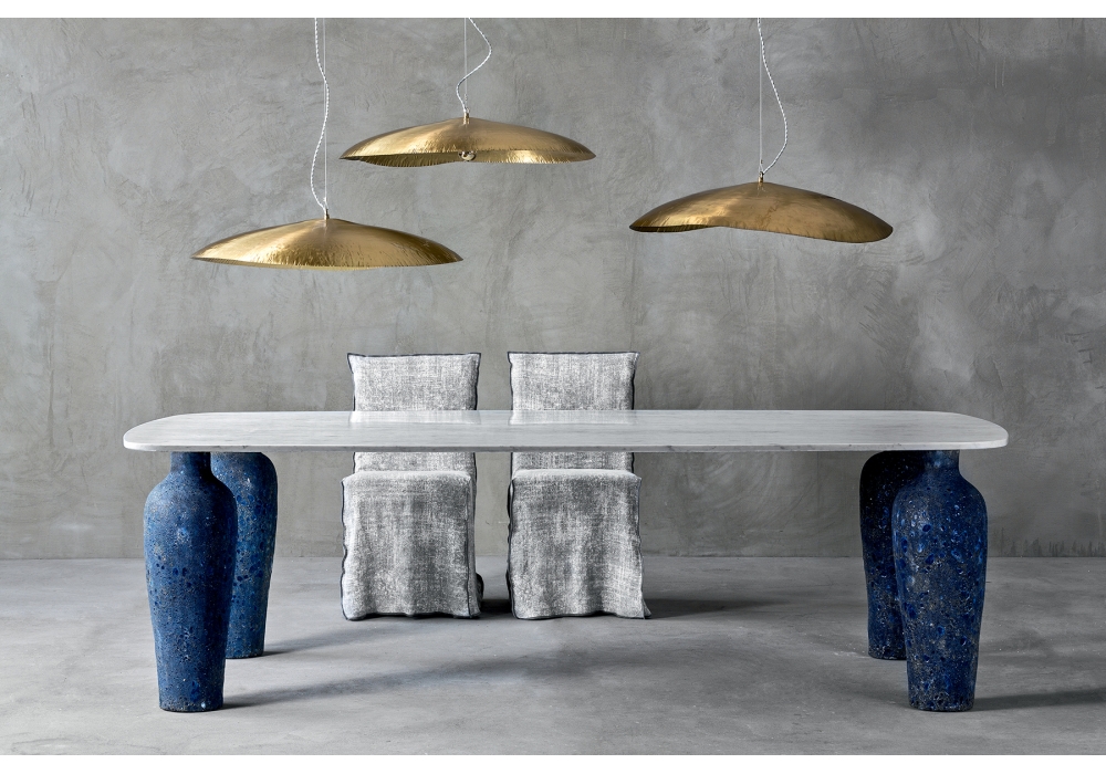 Moon 33 conçue par Paola Navone pour Gervasoni est une table avec pieds en céramique bleu et dessus en marmor.