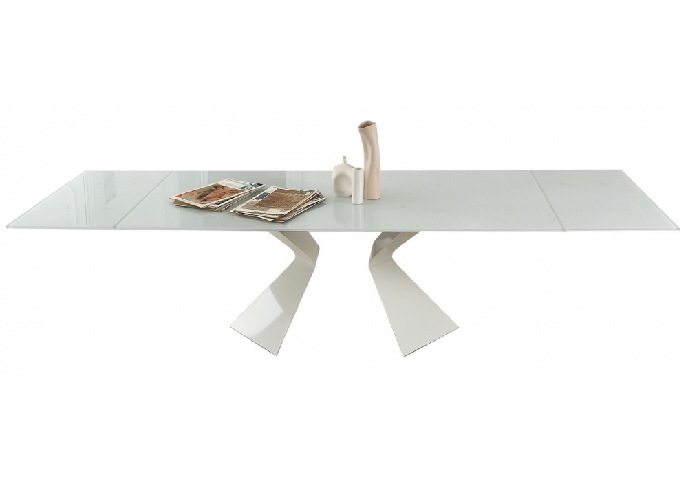 Prora conçue par Mauro Lipparini pour Bonaldo est une table extensible avec structure et base central en métal et plateau/rallonges en bois laqué, cristal ou céramique, disponible en différentes finitions.