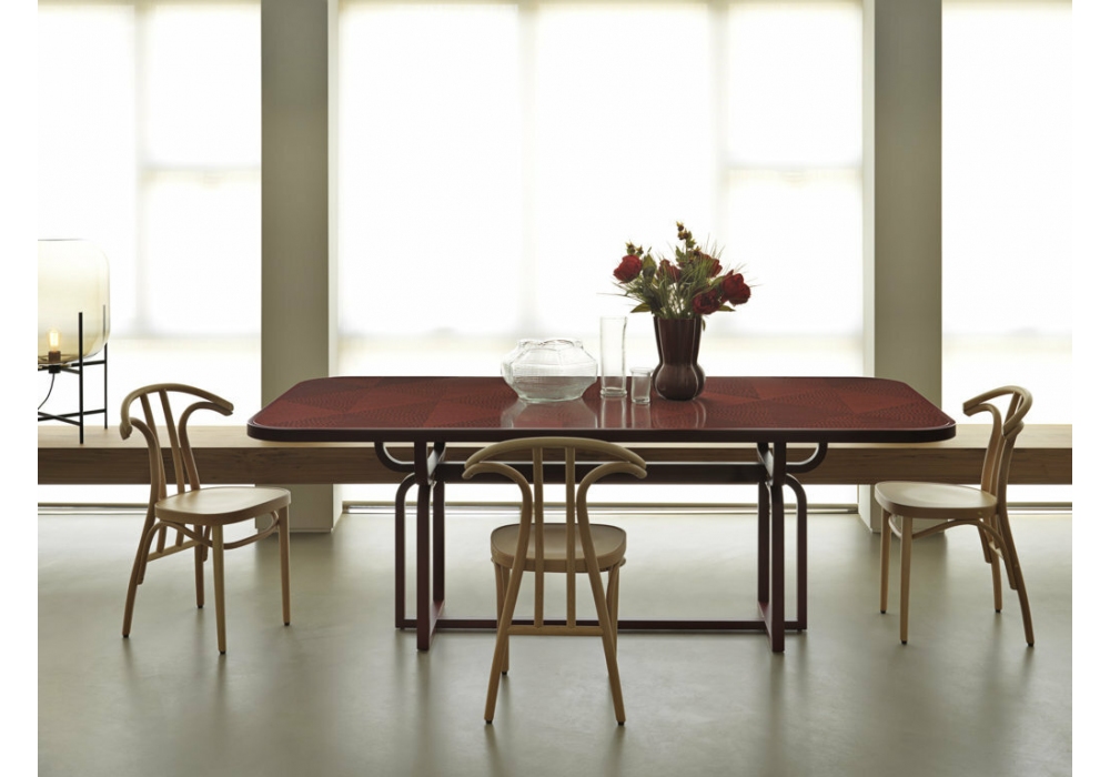 Caryllon Dining Tables conçue par Cristina Celestino pour Gebrüder Thonet Vienna est une table avec structure en hêtre courbé laqué et plateau en bois marqueté. Disponible en différentes finitions.